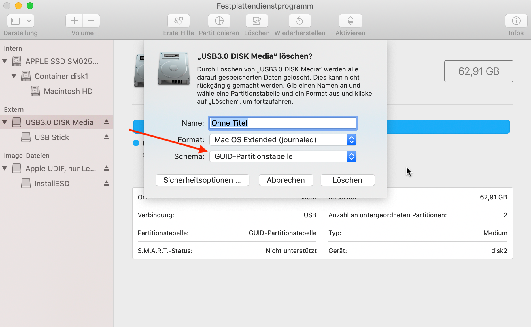Man gibt dem Stick einen beliebigen Namen und wählt als Schema "GUID-Partitionstabelle", sonst erhält man später eine Fehlermeldung.