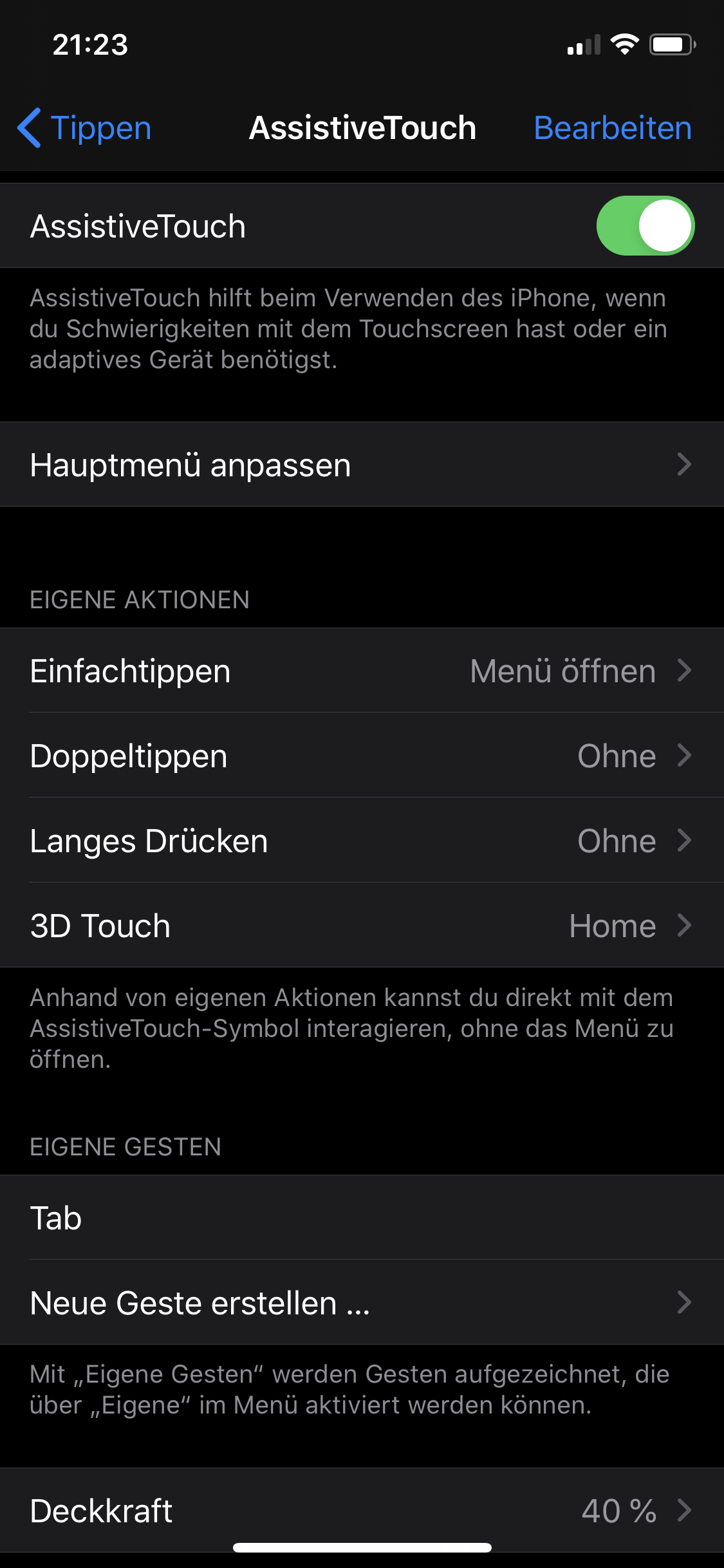 Nun könnt Ihr AssistiveTouch aktivieren. Nach der Aktivierung wählt Ihr im Bereich „eigene Gesten“ den Punkt Neue Geste erstellen … aus.