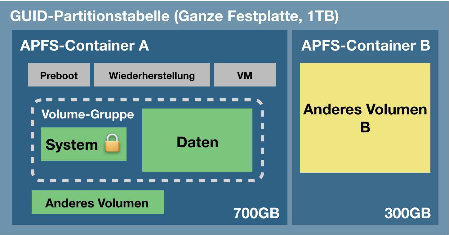 Das Partitionsschema umfasst die gesamte physikalische Festplatte. Im Partitionsschema kann man einen oder mehrere APFS-Container erstellen und in jedem Container kann man eines oder mehrere APFS-Volumes erstellen. Im Gegensatz zur früheren Partitionierungen teilen sich alle Volumes in einem Container den diesem Container zugewiesenen Speicherplatz. Im oben aufgeführten Beispiel haben die drei grauen Hilfspartitionen, das System- und das Daten-Volume sowie das Anderes Volume allesamt Zugriff auf die 700 GB Speicherplatz. Anderes Volume B befindet sich in einem separaten Container und teilt sich daher nicht den physikalischen Speicherplatz mit den Volumes in Container A.