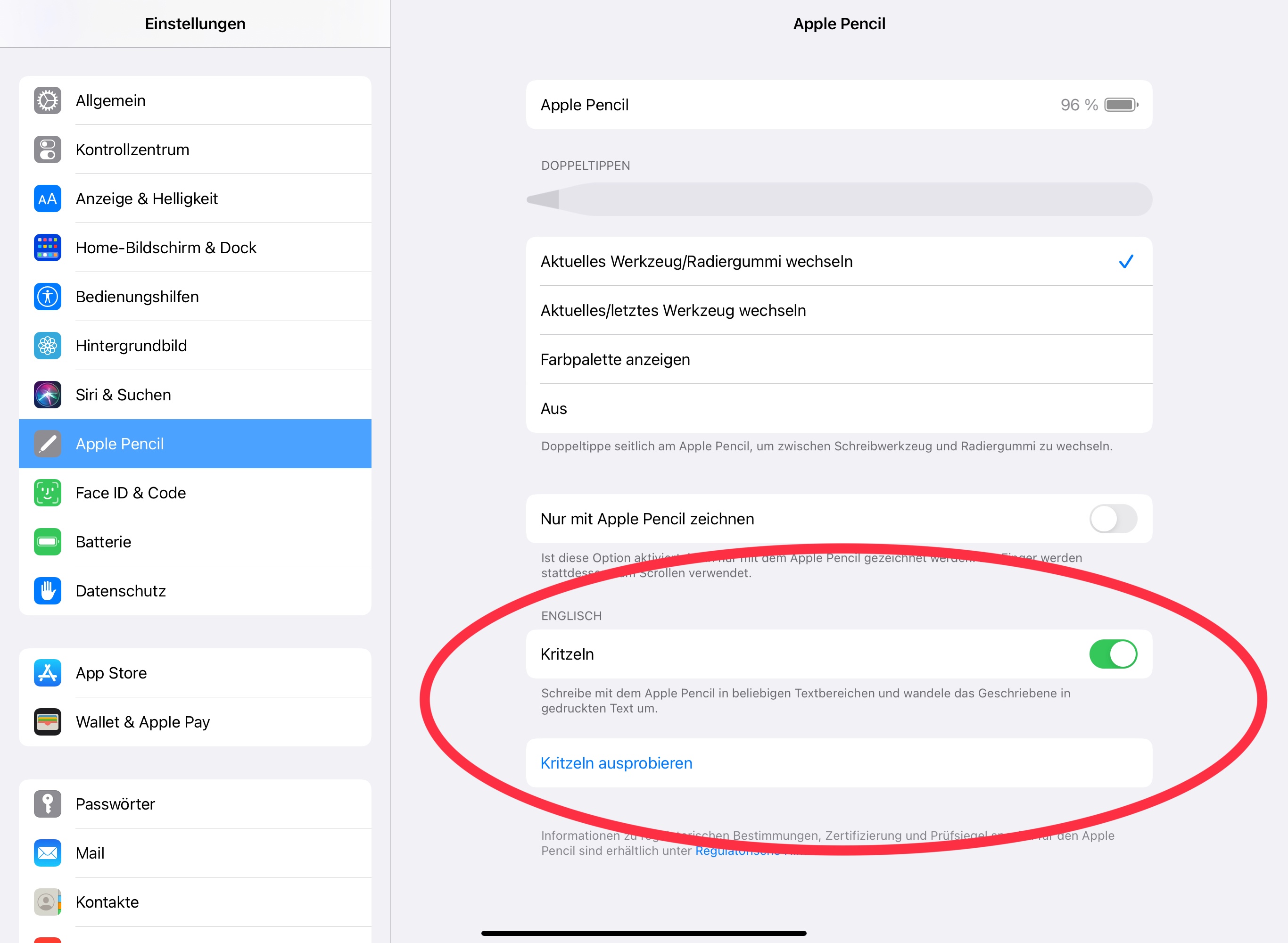 4 Unter den Punkt „Apple Pencil“ sollte nun auch „Kritzeln“ erscheinen, dort könnt ihr auch die Funktionsweise ausprobieren.