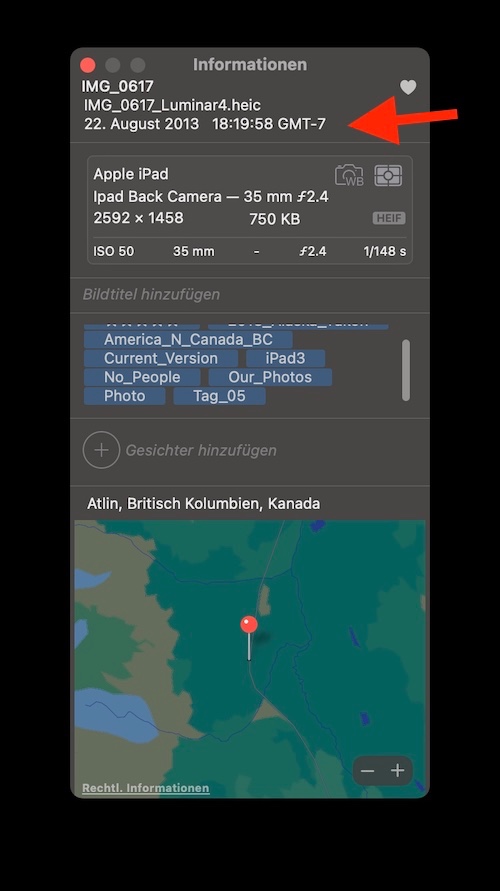 Wie kann man die Aufnahmezeit eines Fotos in der Info mit dem Zeitzonenkürzel anzeigen
