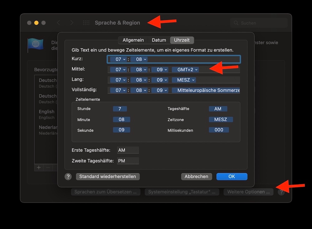 Achtung! Das folgende Verfahren geht in Fotos 8 unter macOS 13 Ventura nicht mehr, da sich die Systemeinstellungen für Datum und Uhrzeit stark geändert haben und wir die Formate nicht mehr flexibel ändern können. Wir müssen jetzt auf einen Terminalbefehl zurückfallen, siehe: Die Aufnahmezeit eines Fotos in der Info eines Fotos anzeigen - macOS 13 - Apple Community