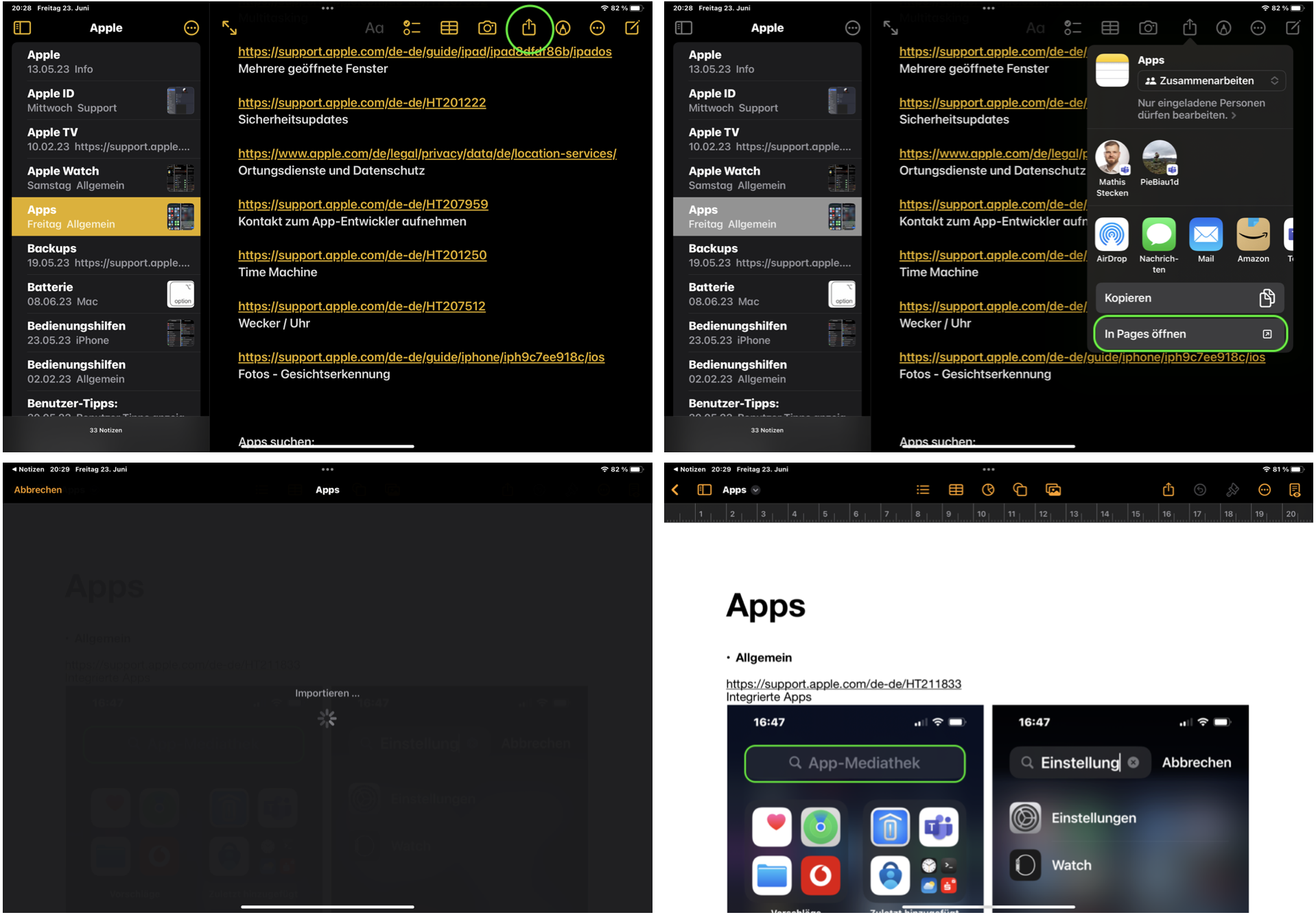 Wie du auf den beiden unteren Bildern sehen kannst, werden die Notizen importiert und danach in Pages geöffnet.