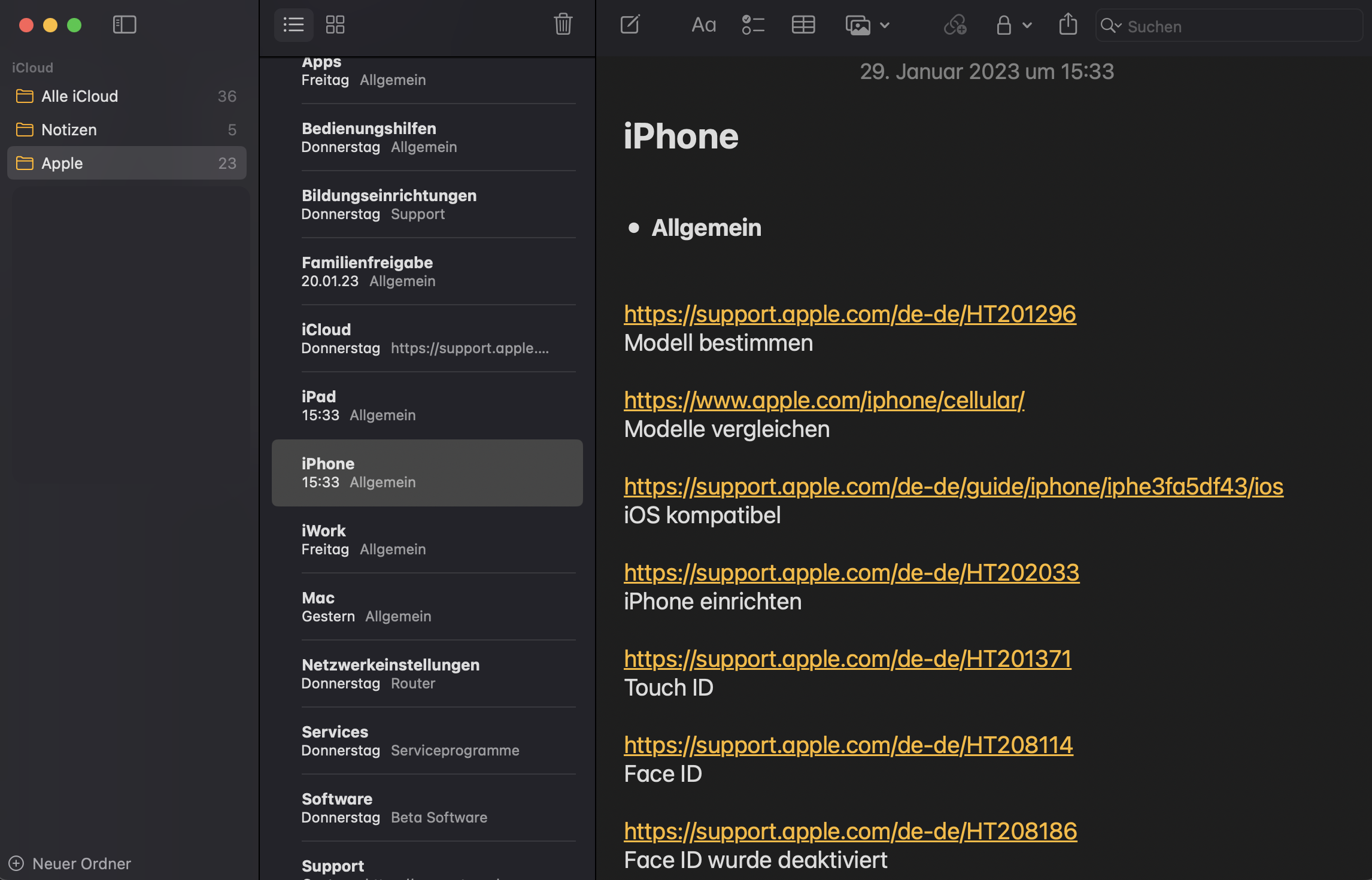 Wie auf dem Bild zu sehen ist, habe ich die von mir genutzten Informationen unterteilt und entsprechend angeordnet. Diese Struktur wird auch dann beibehalten, wenn ich Notizen geräteübergreifend auf dem Mac oder iPad nutze.