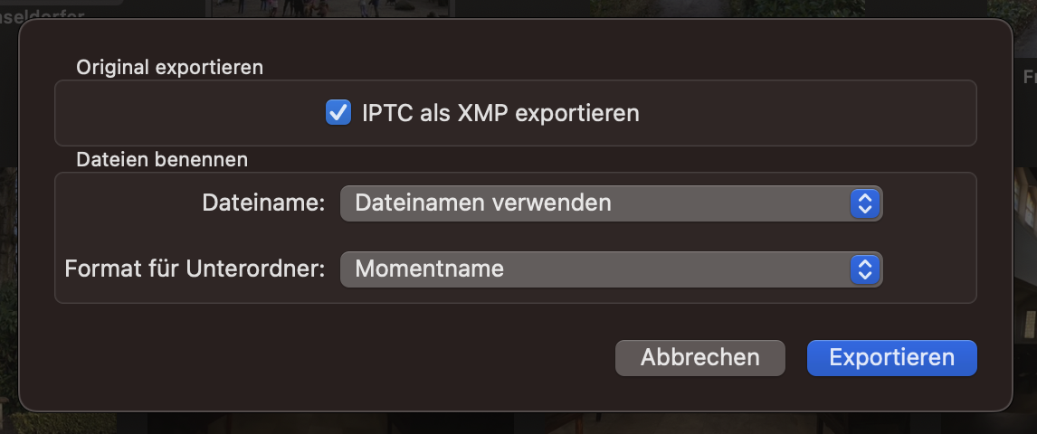 - Mit "Format für Unterordner > Momentname" werden alle Fotos, die am selben Tag am selben Ort aufgenommen worden sind, in einem gemeinsamen Ordner exportiert, der nach dem Ort und dem Datum benannt ist. Damit lassen sich die Bilder leicht finden.