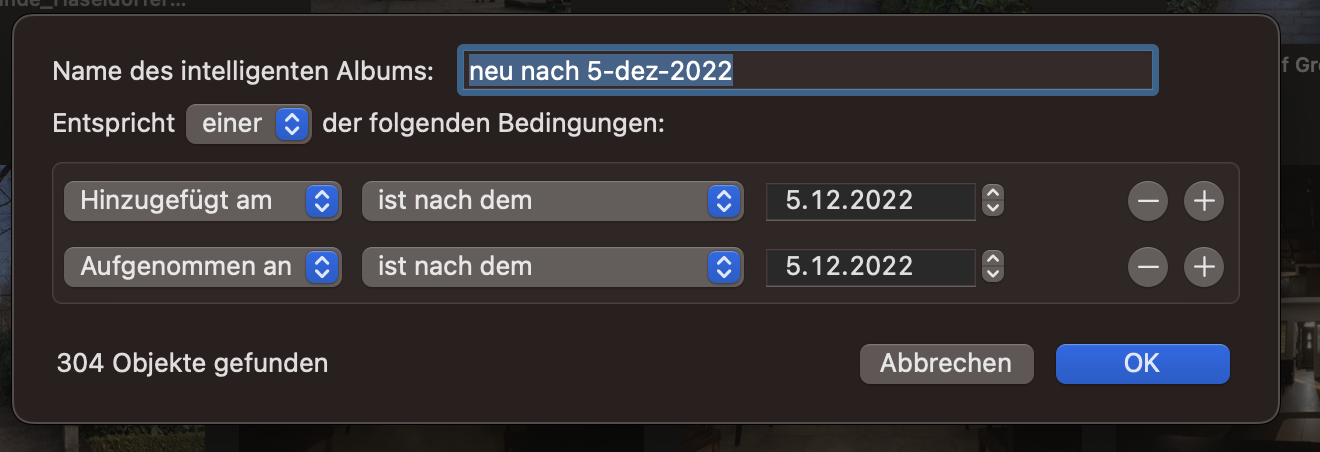 Für das Sichern der Originale exportiere ich regelmässig die Originale der neu importierten Fotos. Das geht sehr einfach mit einem intelligenten Album mit Regeln, die alle neuen Fotos zusammenfasst: