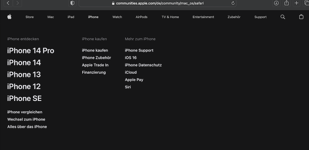 Wenn wir auf den Seiten der Apple Communities unterwegs sind, fällt vom oberen Bildrand oft ein schwarzer Vorhang mit den links zum Apple Store herunter, der recht irritierend ist, wenn wir nur mit dem Zeiger die Tabs erreichen wollten.