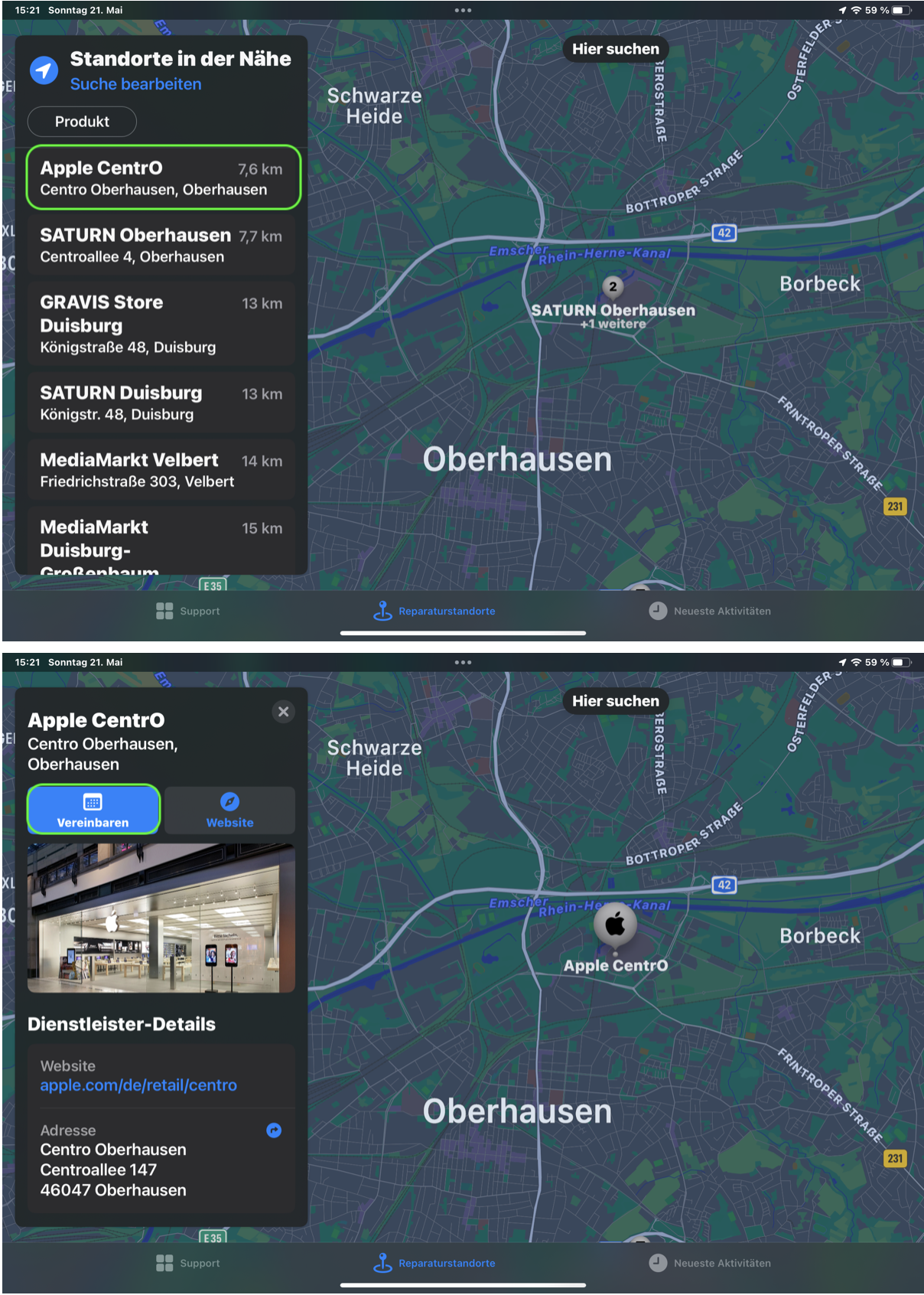 Auch die Suche nach einem autorisierten Service-Anbieter unterscheidet sich nicht grundliegend von der auf dem iPhone.
