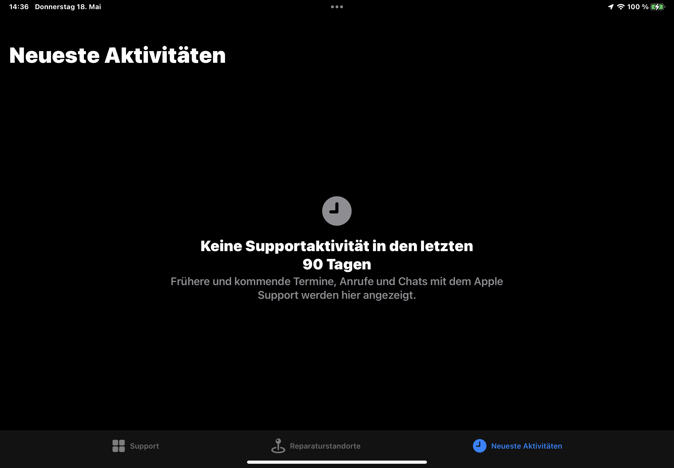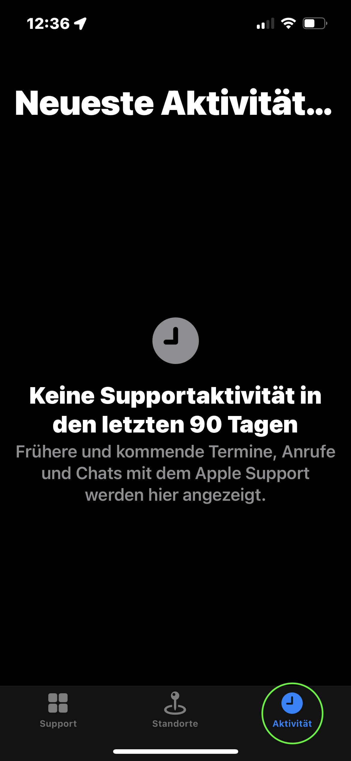 Vereinbarte Termine, Telefonate oder Chats mit dem Apple Support kannst du im Bereich Aktivität verfolgen.