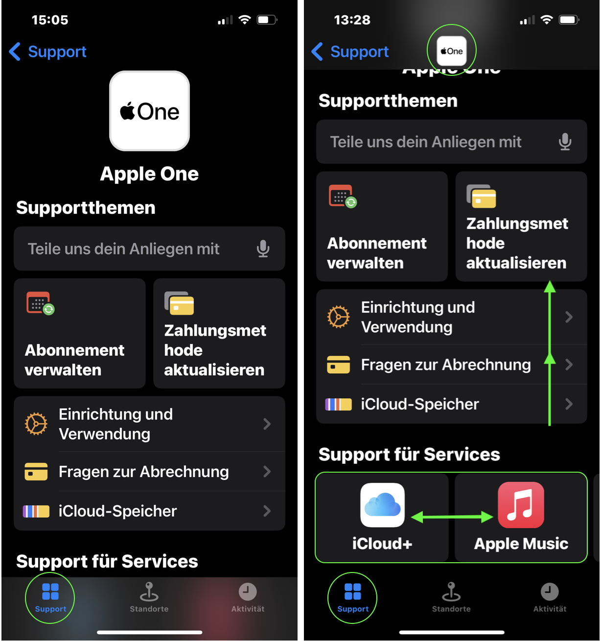 Dort hast du die Möglichkeit, auf die Bestandteile von Apple One zuzugreifen, ohne diese Ansicht verlassen zu müssen. Wische dazu mit dem Finger nach oben, bis du zu der Ansicht „Support für Services“ kommst. Zu den einzelnen Services gelangst du, wenn du hier mit dem Finger nach links bzw. rechts wischst.