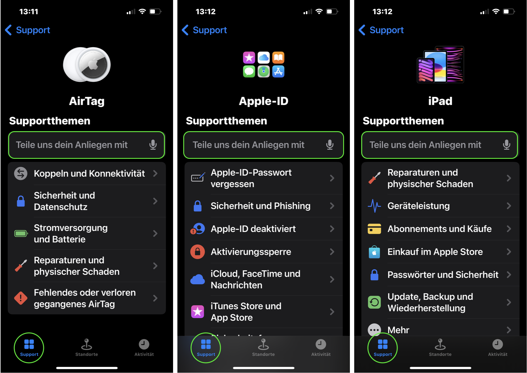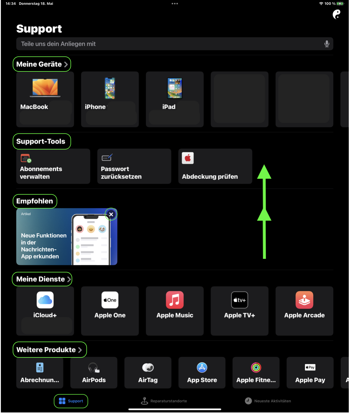 Öffnest du die Support App auf deinem iPad, erwartet dich derselbe App-Aufbau, wie ich diesen für das iPhone beschrieben habe.