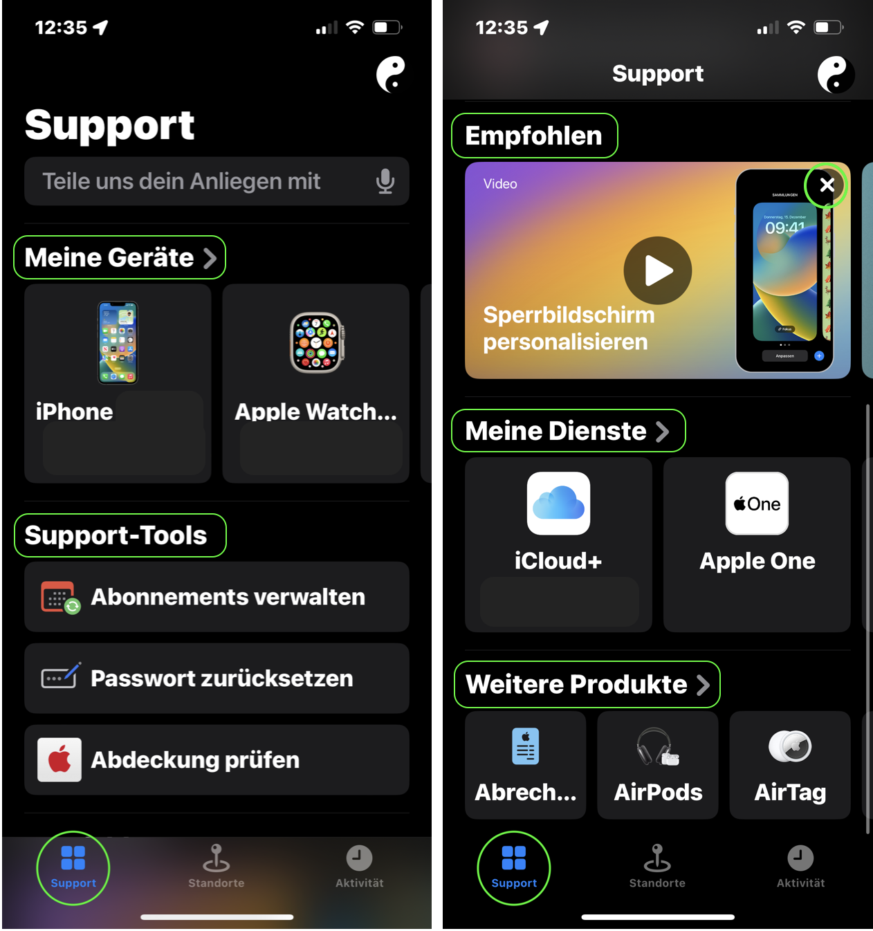 Öffnest du die App auf deinem iPhone, gelangst du in der Ansicht Support, der sich in 5 Bereiche unterteilt.