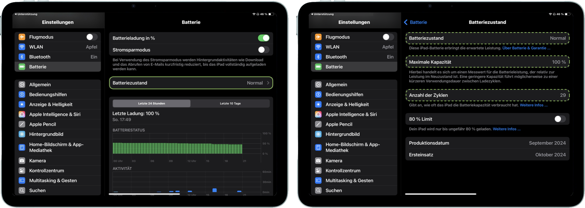 Das iPad Pro (M4) bietet (wie auch das iPhone 15 Pro) eine detailliertere Darstellung des Batteriezustands und der Anzahl der Ladezyklen.