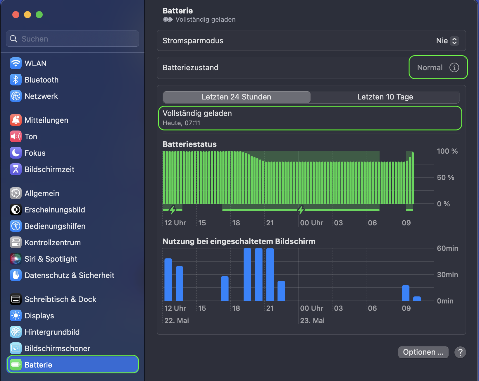 Wie du hier sehen kannst, wird der Batteriezustand mit „normal“ beschrieben. Liegt die Kapazität jedoch unter dem Normalzustand und der Hinweis „Service empfohlen“ wird angezeigt, solltest du die Batterie tauschen lassen.