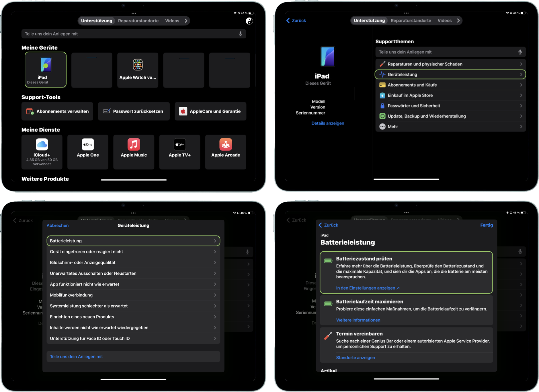 Um die Batterieleistung des iPhones zu ermitteln, bietet die Support App von Apple eine Überprüfung des Batteriezustandes an. Öffnest du die App, tippst auf dein iPhone und wählst "Geräteleistung,