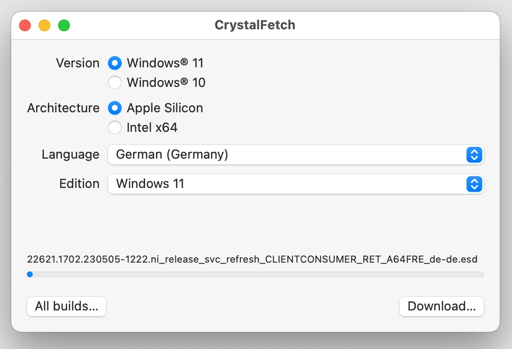 Mit CrystalFetch können sowohl Windows 10 als auch Windows 11 ISO Daten geladen werden, sogar direkt in deutscher Sprache und wichtig für die Virtualisierung auf einem M1/M2 Mac, als Windows ARM Version.