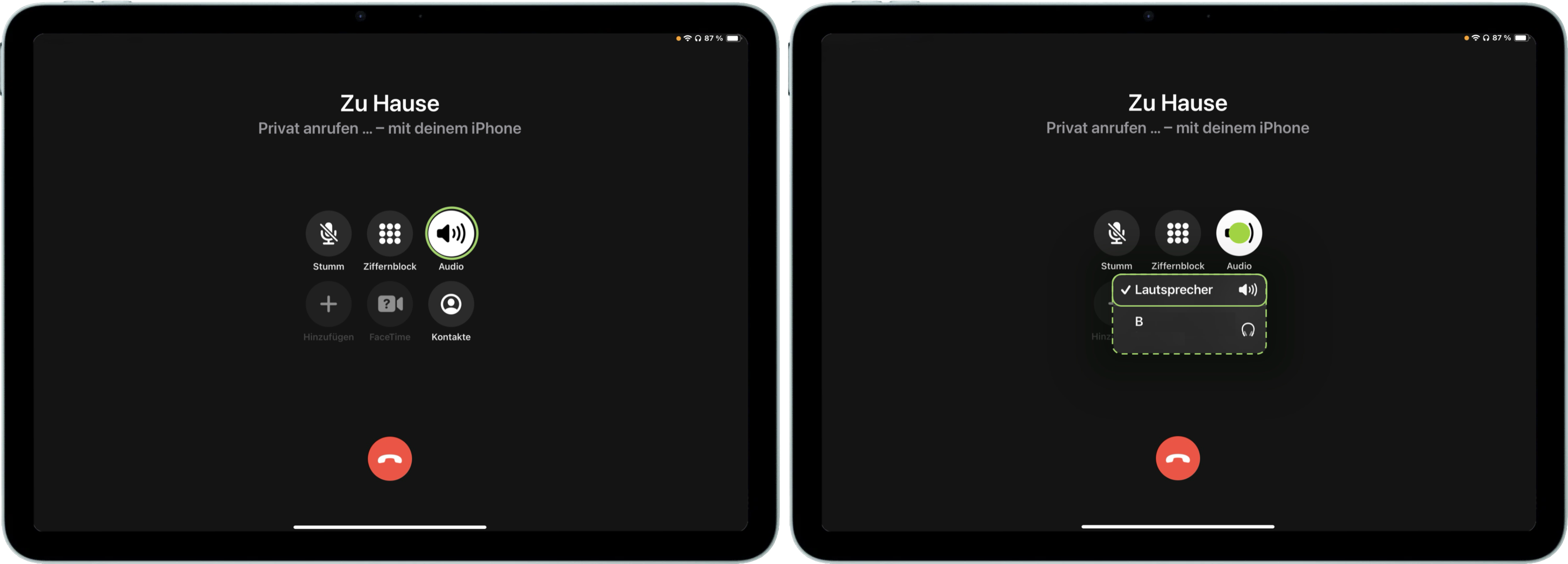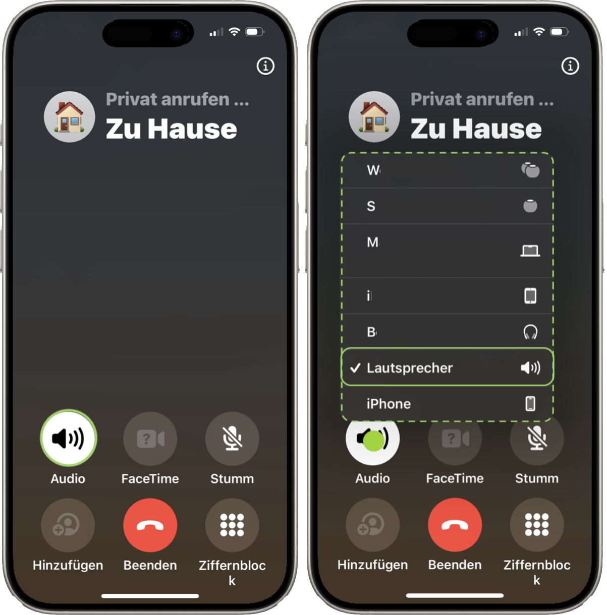 Ab jetzt werden ein- und ausgehende Anrufe automatisch auf den integrierten Lautsprecher des iPhones umgeleitet. Führst du mal ein vertrauliches Gespräch oder möchtest einen Anruf nicht umleiten, tippe länger auf das hell angezeigte Symbol.