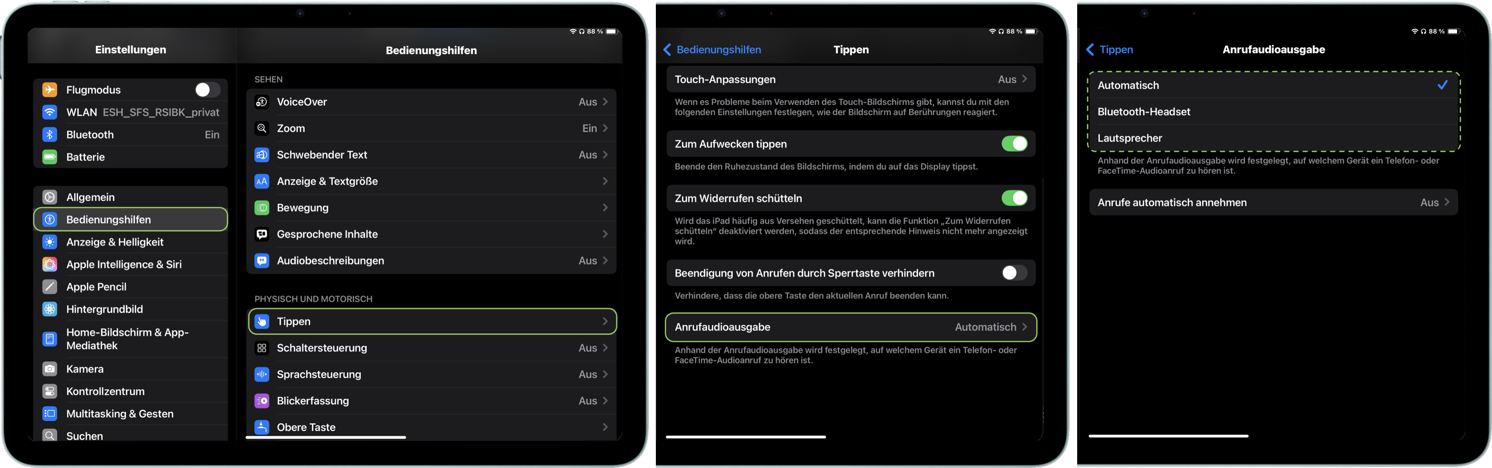Scrolle auf der rechten Seite zum Punkt „Anrufaudioausgabe“, tippe darauf und setze den Haken auf „Lautsprecher". Tätigst du einen Anruf über dein iPad oder nimmst diesen dort an, erfolgt die Ausgabe auch hier über den Lautsprecher.