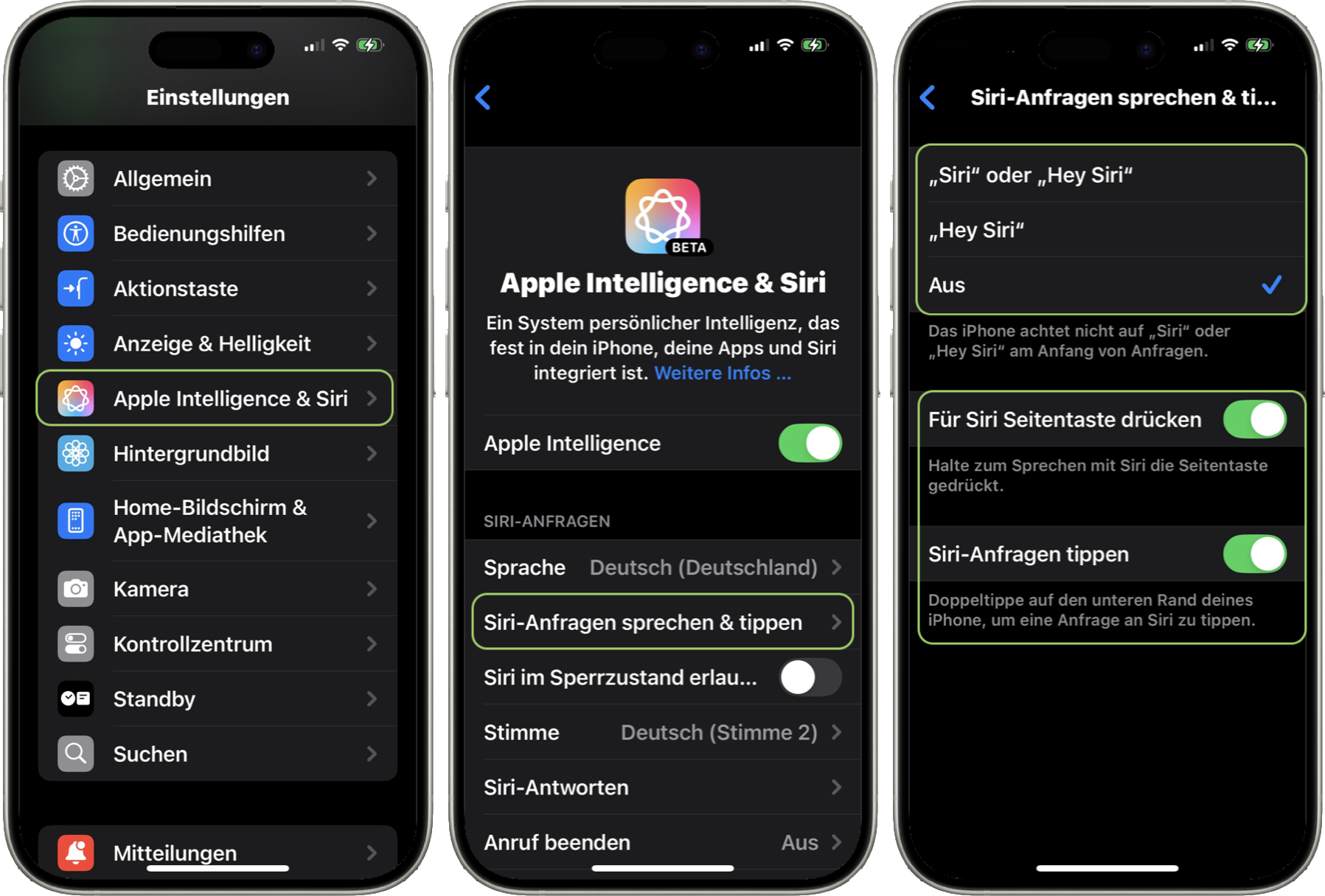 einrichten, indem du den Haken auf „Aus“ setzt und die Buttons neben „Für Siri Seitentaste drücken“ und „Siri-Anfragen tippen“ aktivierst.