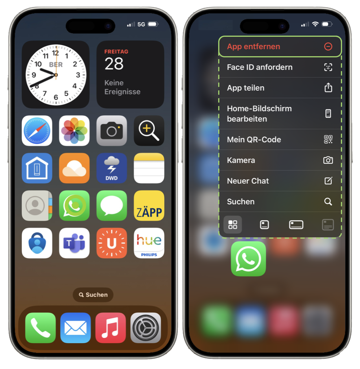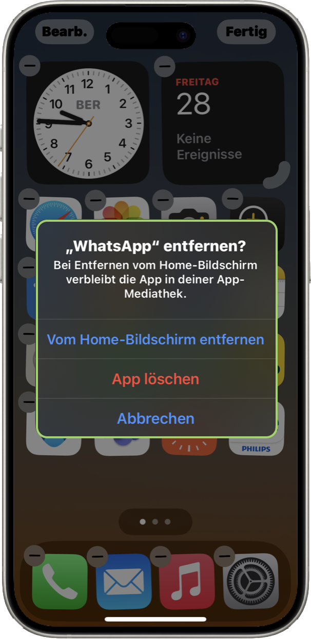 und wähle aus, ob die App nur vom Home-Bildschirm entfernt oder gelöscht werden soll.