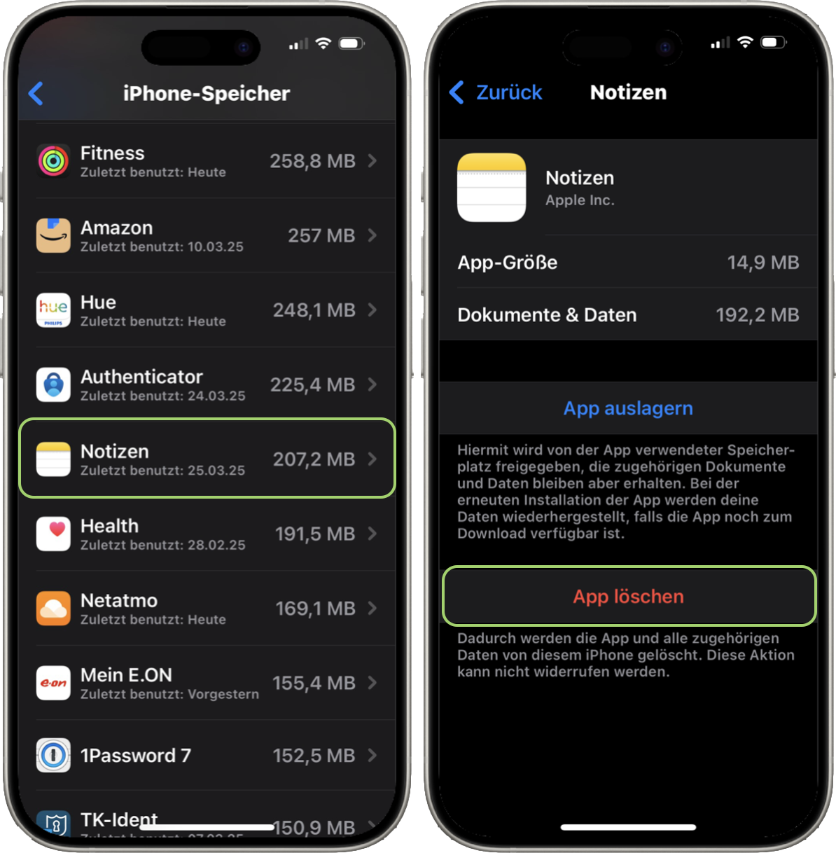 Lagerst du die App aus, wird der verwendete Speicherplatz freigestellt, die zugehörigen Dokumente und Daten bleiben erhalten. Anders sieht es aus, wenn du die App auf diesem Weg löschst. Dann werden auch die dazugehörigen Daten von deinem iPhone entfernt. Hier wiederhole ich noch einmal den Hinweis: