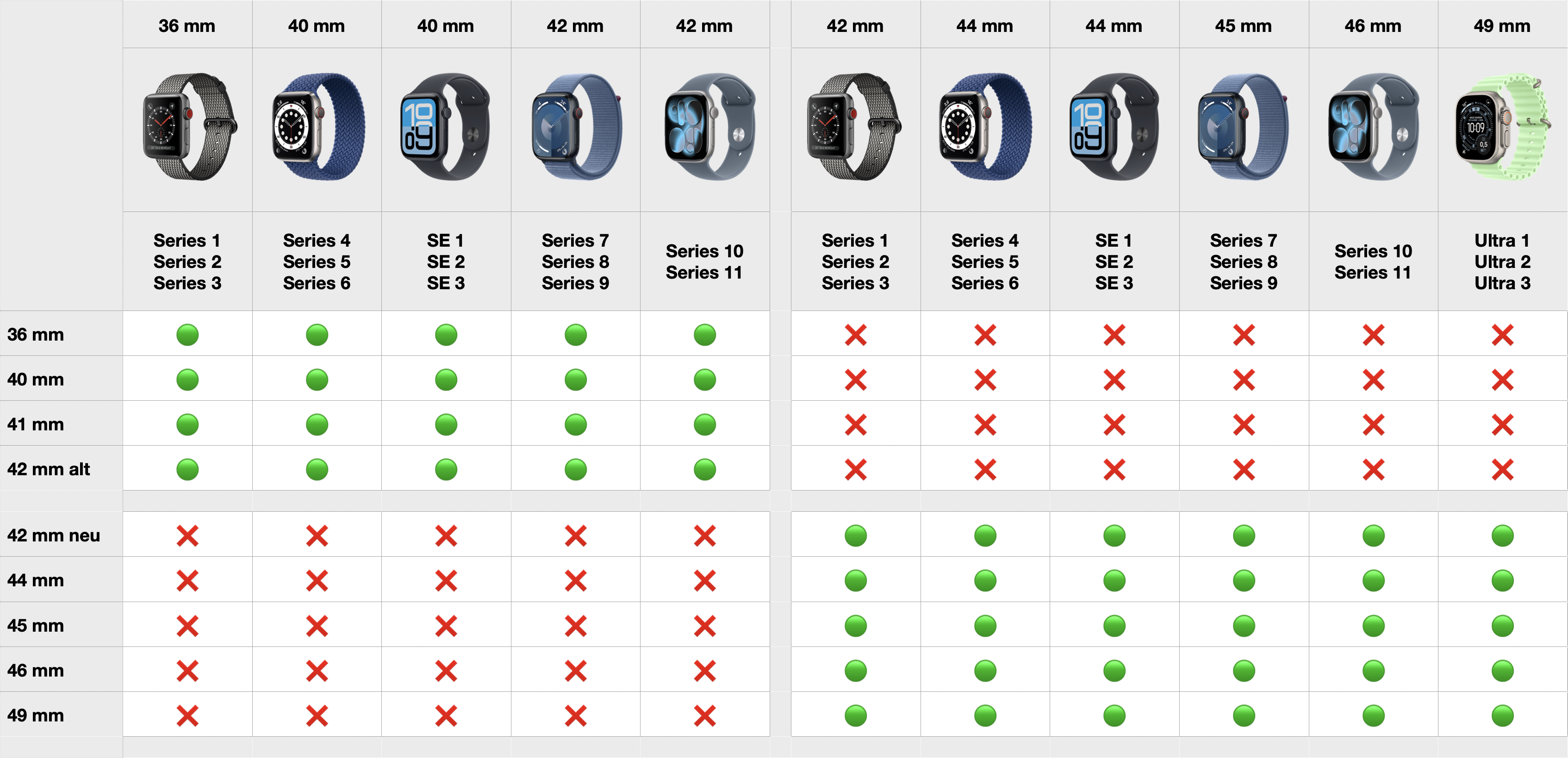 ❌ bedeutet, das Armband ist mit der Apple Watch nicht kompatibel.