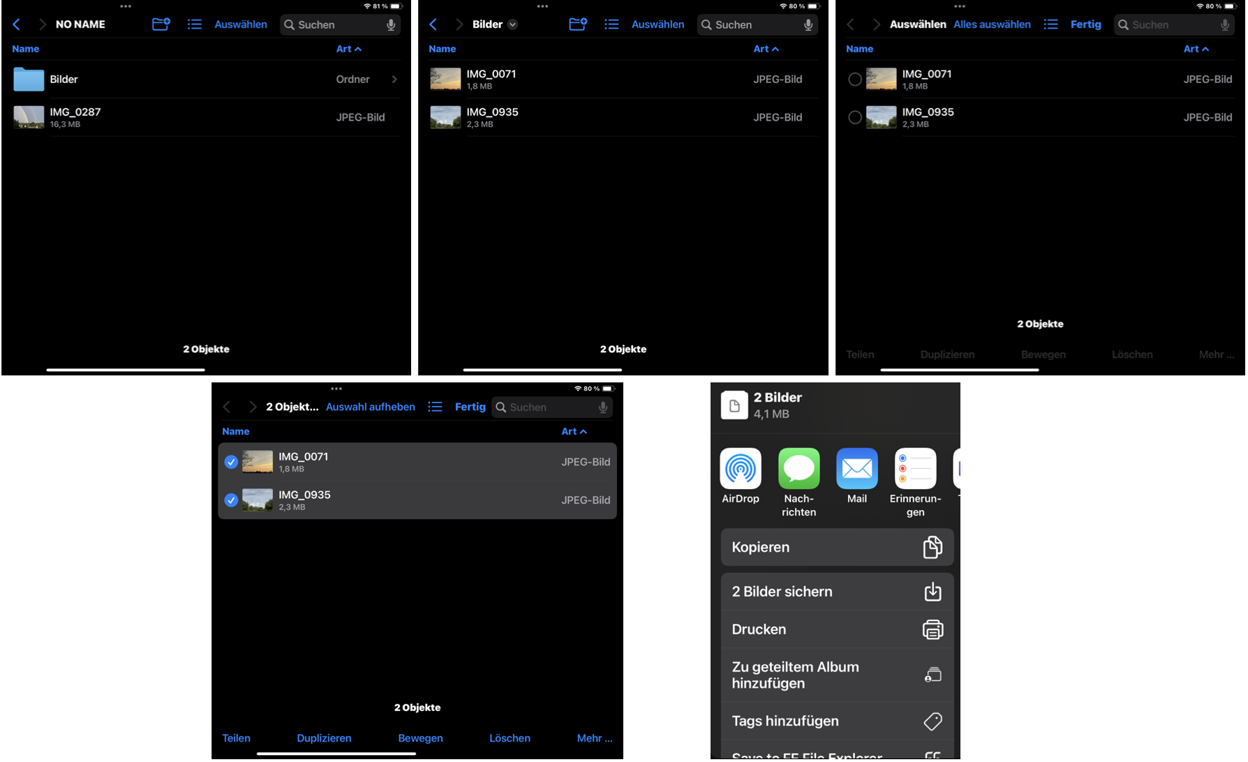 Im folgend angezeigten Menü findest du den Punkt „Auswählen“. Über diesem kannst du entweder einzelne Fotos auswählen oder auch “Alles auswählen“ nutzen.