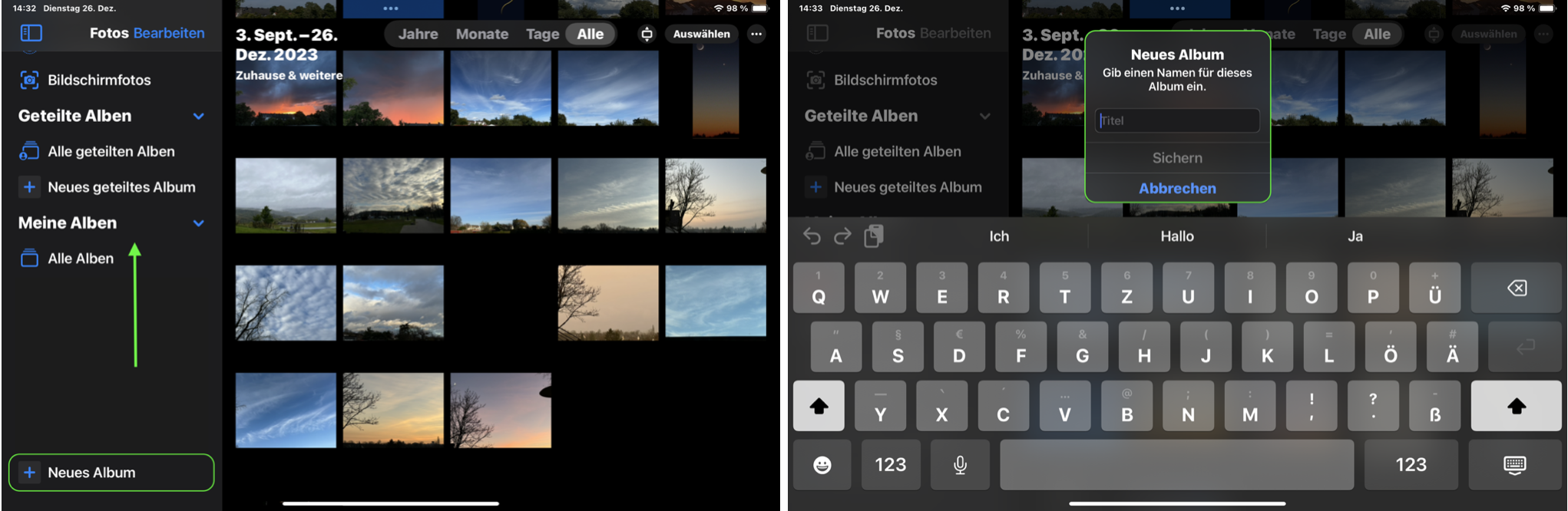 Auf dem iPad; scrolle in der Fotos App auf der Seitenleiste nach unten, wähle hier „Neues Album“ und tippe darauf.
