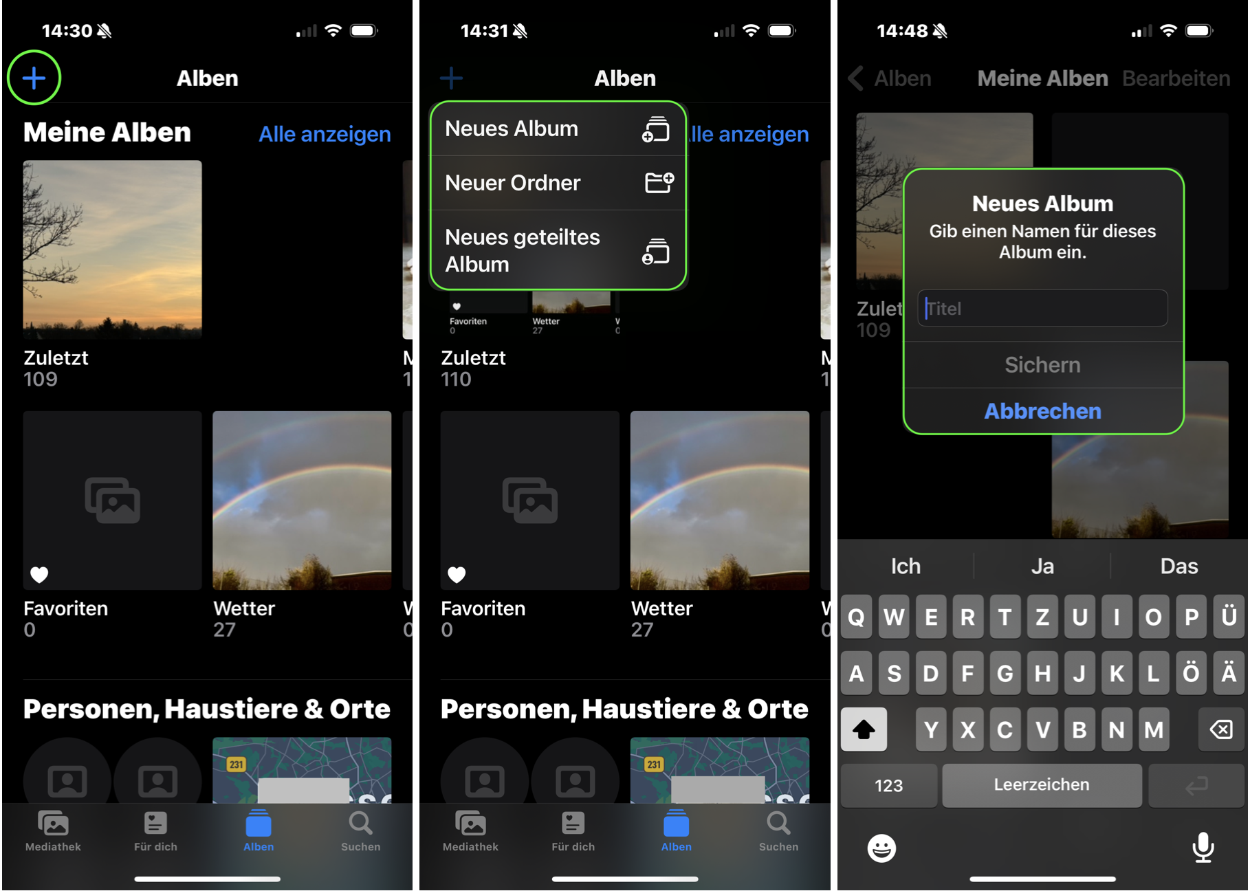Innerhalb der nun angezeigten Auswahl kannst du wählen, ob du ein Album, einen Ordner oder ein geteiltes Album erstellen möchtest. Vergib einen Namen und tippe dann auf „Sichern“.