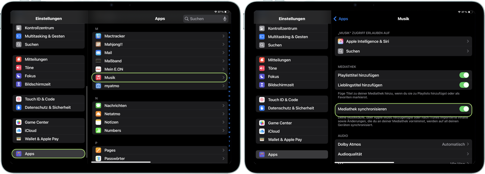 und schau auf der rechten Seite des Displays nach, ob auch hier „Mediathek synchronisieren“ aktiviert ist.