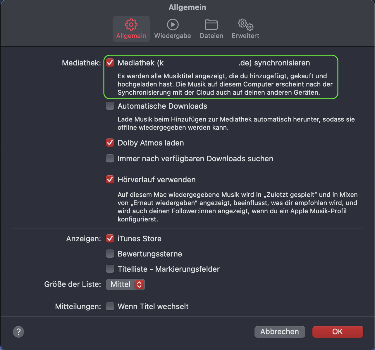 Über „Einstellungen“ gelangst du zu dem hier dargestellten Fenster, in dem du den Haken links neben „Mediathek (…) synchronisieren“ aktivierst.