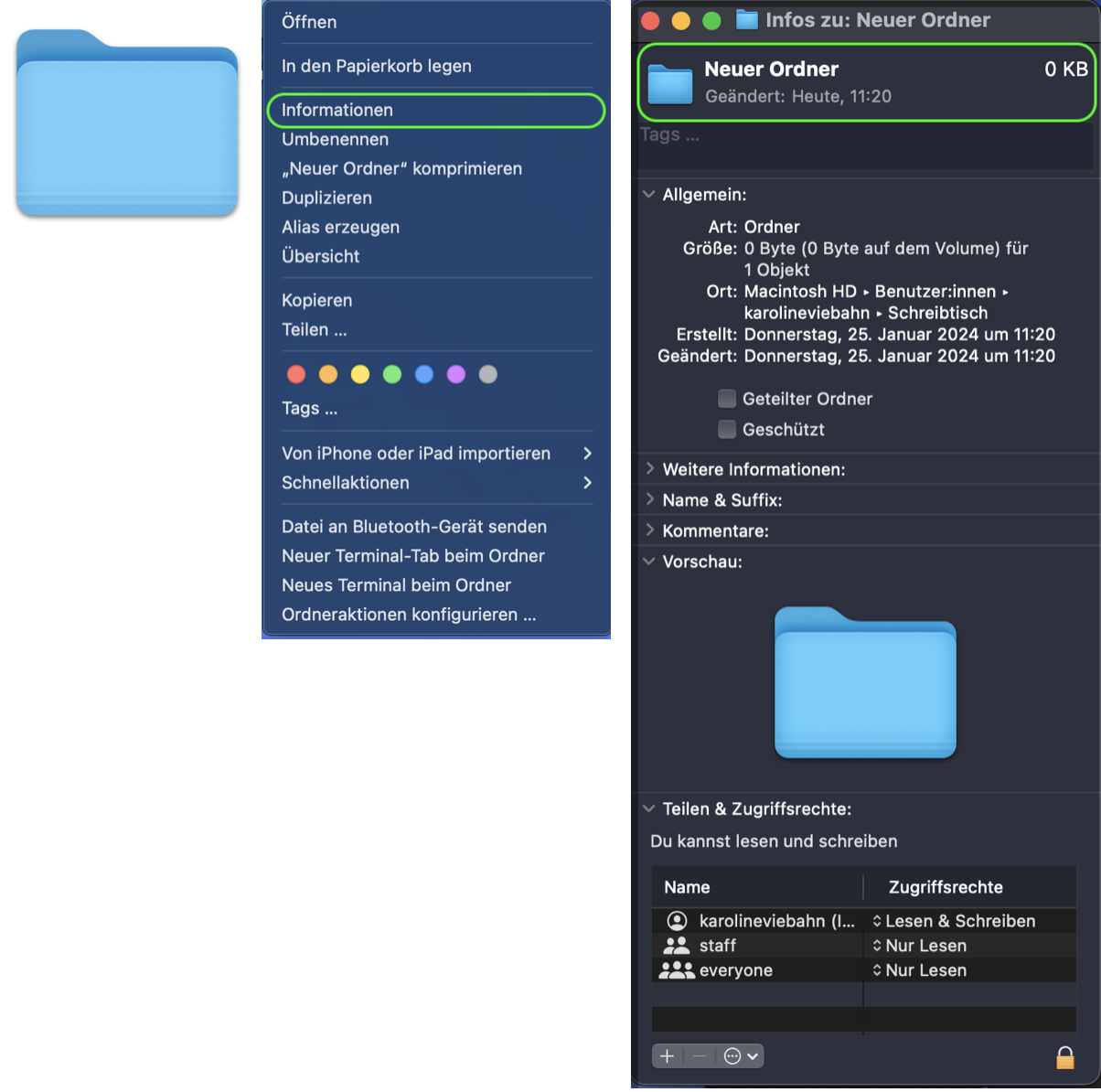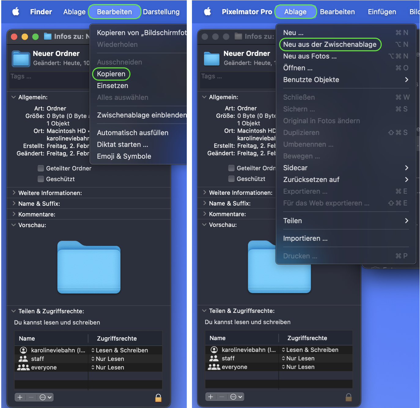 Führe einen Doppelklick aus und achte dabei auf den Rand (s. Kreis um das Ordnersymbol). Wähle „Bearbeiten“ und dann „Kopieren“ (⌘ + C) aus.