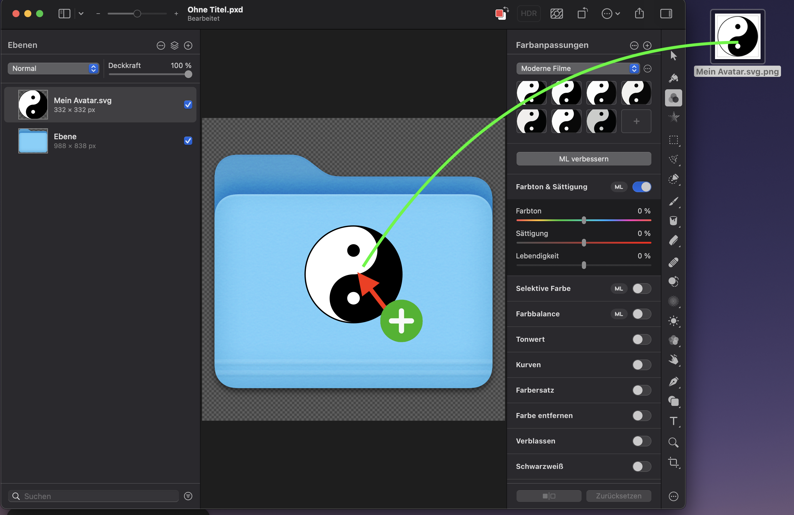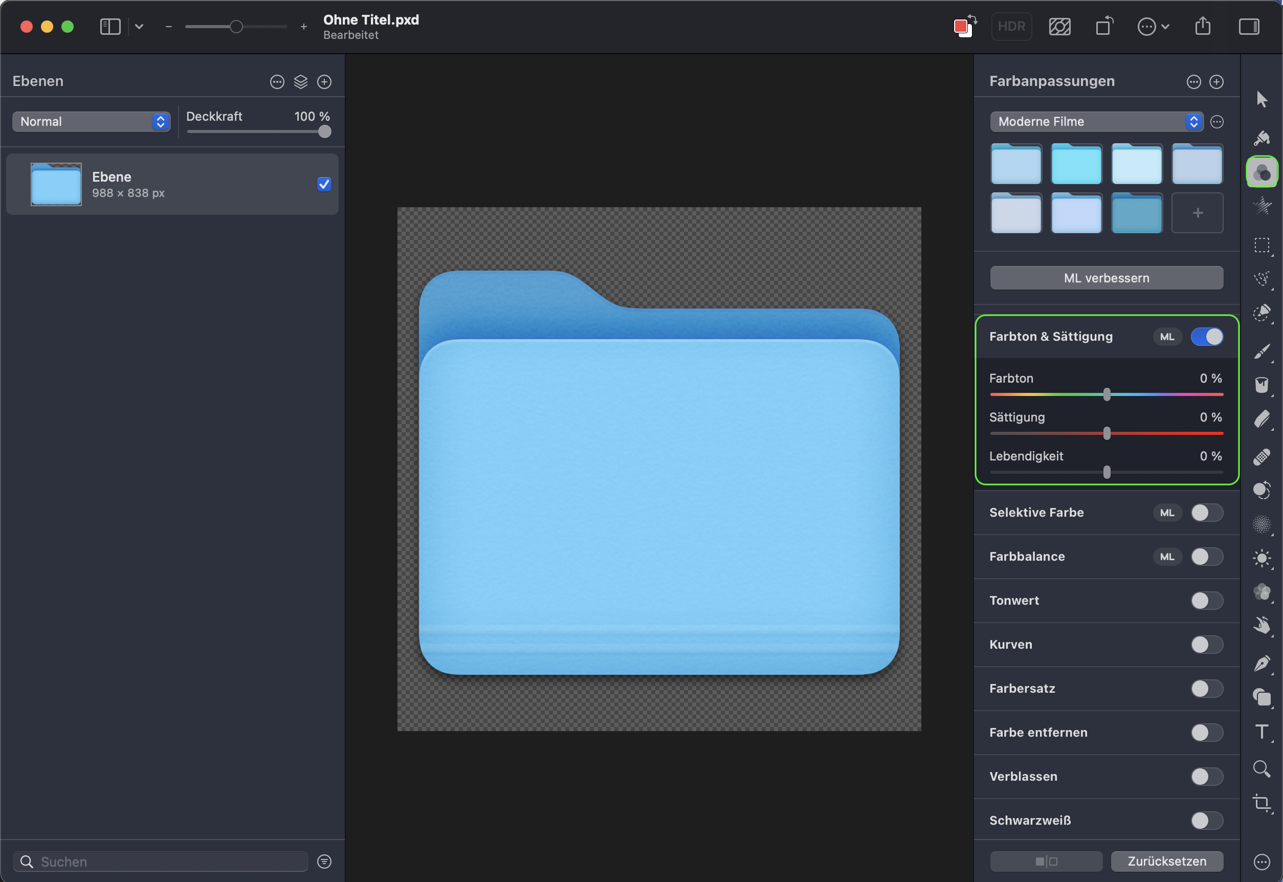 Aus der Zwischenablage wird das das Ordner-Symbol in der App Pixelmator zur Verfügung gestellt, sodass du es nun bearbeiten kannst. Suche rechts in der Seitenleiste „Farbanpassungen“ und gehe zu „Farbton & Sättigung“.