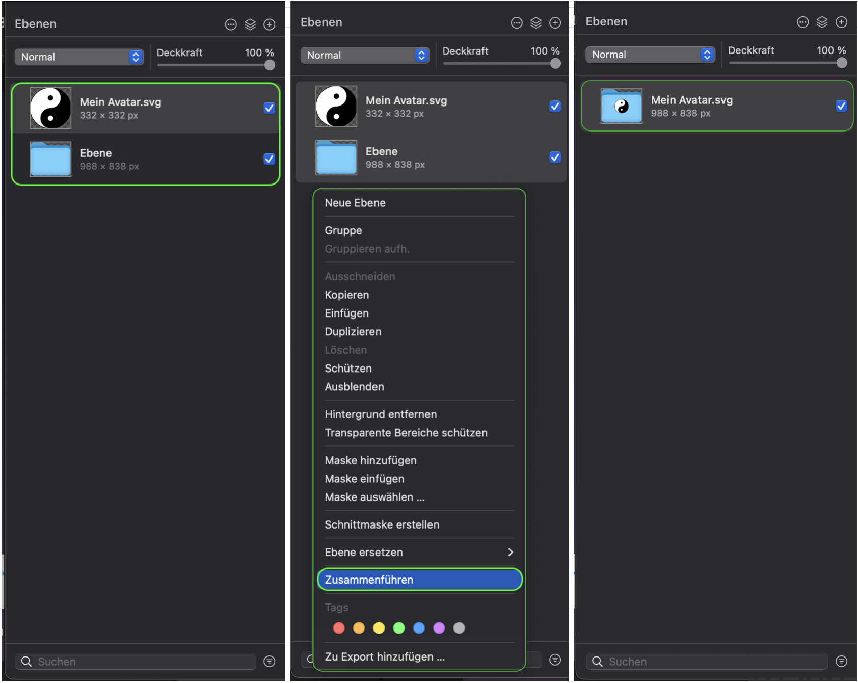 Links in der Seitenleiste entsteht durch das Hinzufügen des Symbols eine zweite Ebene. Damit du das von dir erstellte Bild verwenden kannst, musst du beide Ebenen zusammenführen. Markiere beide Ebenen, indem du die zweite Ebene zusammen mit der Shift-Taste (⇧) anklickst. Klicke mit der rechten Maustaste auf beide Ebenen und wähle „Zusammenführen.