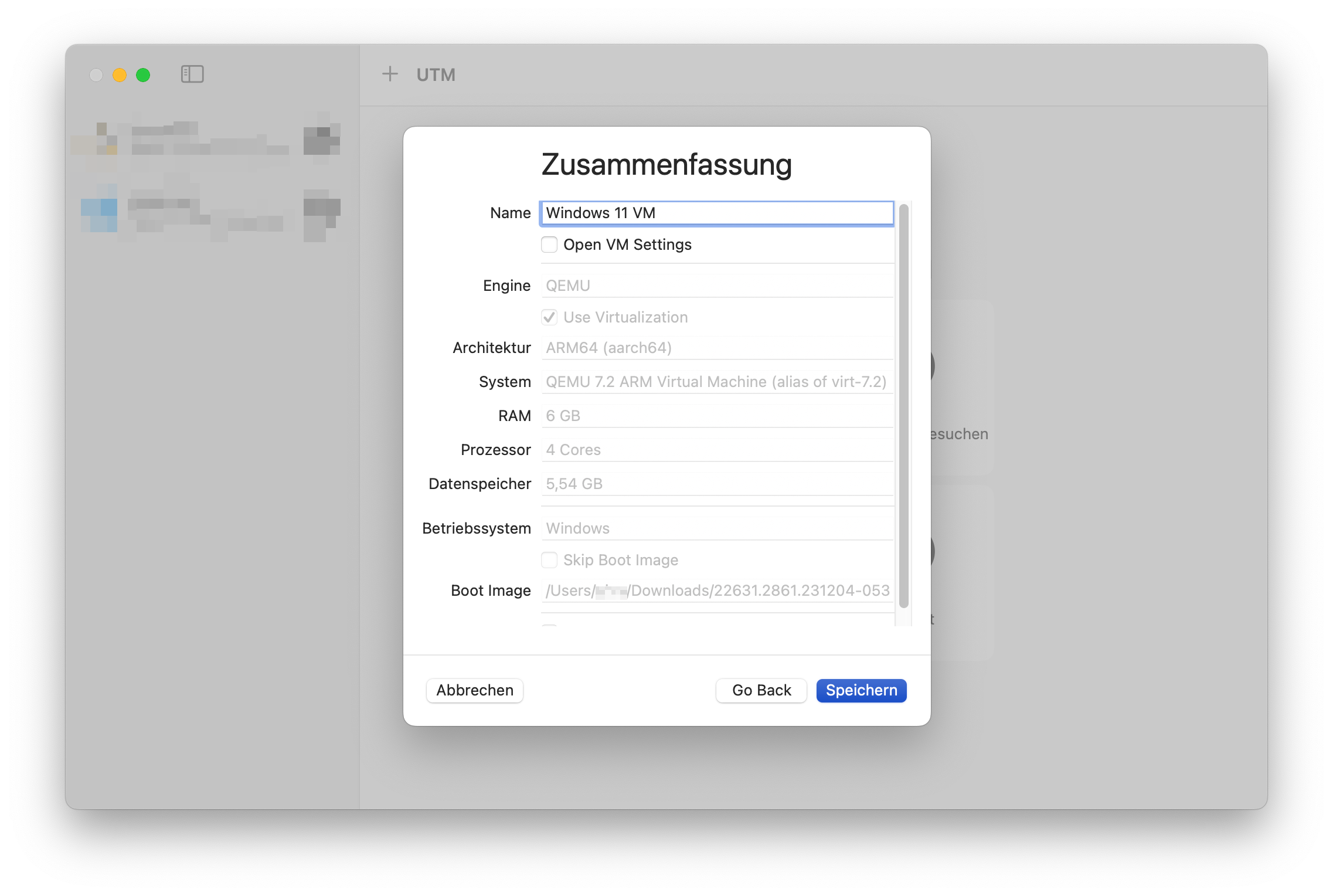 Deine Virtuelle Maschine ist bereit und Windows kann jetzt installiert werden. In der UTM App Übersicht kannst du alle deinen Einstellungen nochmals einsehen. Möchtest du nachträglich etwas ändern, kannst du das über das Einstell-Symbol oben rechts erledigen. Hier findest du auch tiefergreifende Einstellungen zu deiner angelegten VM.
