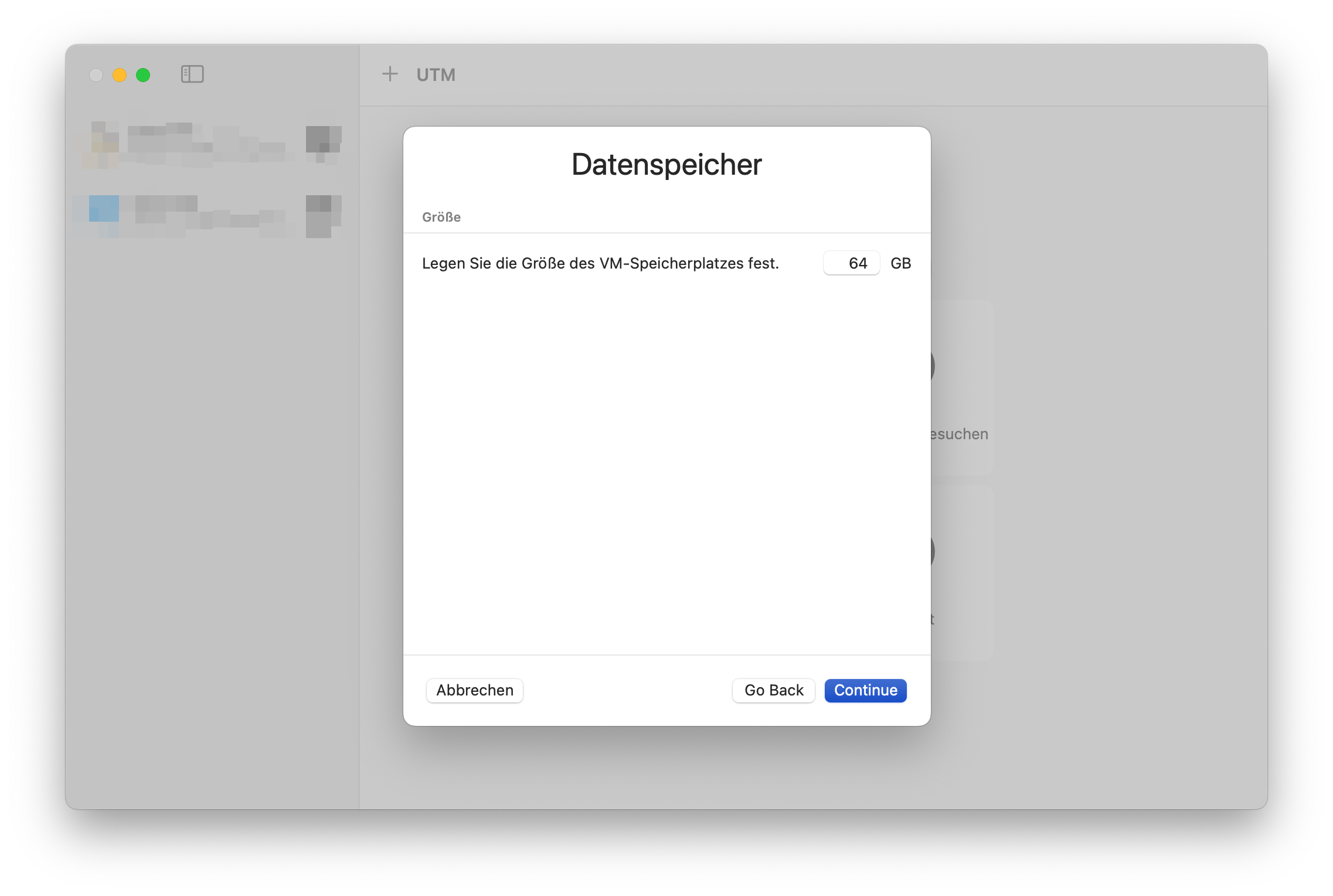 7. Im nächsten Fenster wird die maximale Festplattengröße der VM eingestellt. Diese darf nicht unter 64GB liegen (Mindestanforderung für Windows 11). Beachtet dabei, dass dieser Speicherplatz nicht sofort belegt wird, es ist vielmehr eine virtuelle Festplatte die stetig wachst, je nachdem wie viel Speicherplatz Windows selbst und alle installierten Programme benötigen. Dennoch sollte auf deinem Mac genügend freier Speicherplatz vorgehalten werden. Für dieses Beispiel wähle ich die Mindestanforderung von 64GB und bestätige dies mit einem Klick auf "Continue".