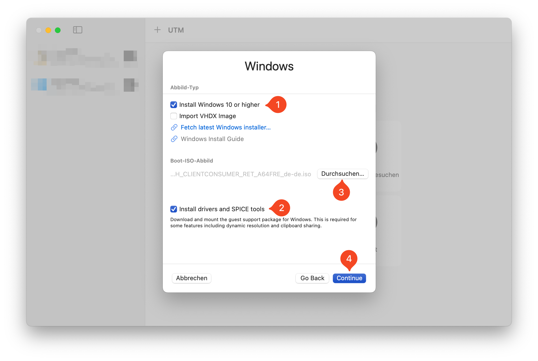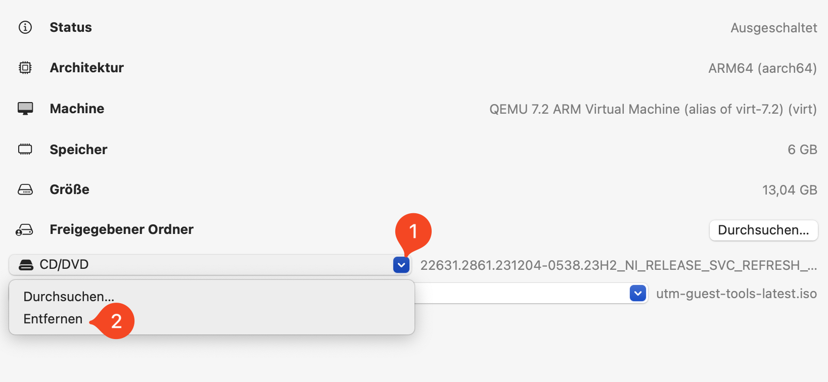 Nach der Einrichtung von Windows und der Installation der SPICE-Tools, können die beiden ISO-Dateien ausgeworfen werden. Hierzu in der UTM App Übersicht die beiden Laufwerke bzw. die Auswahl der beiden ISO-Dateien entfernen.