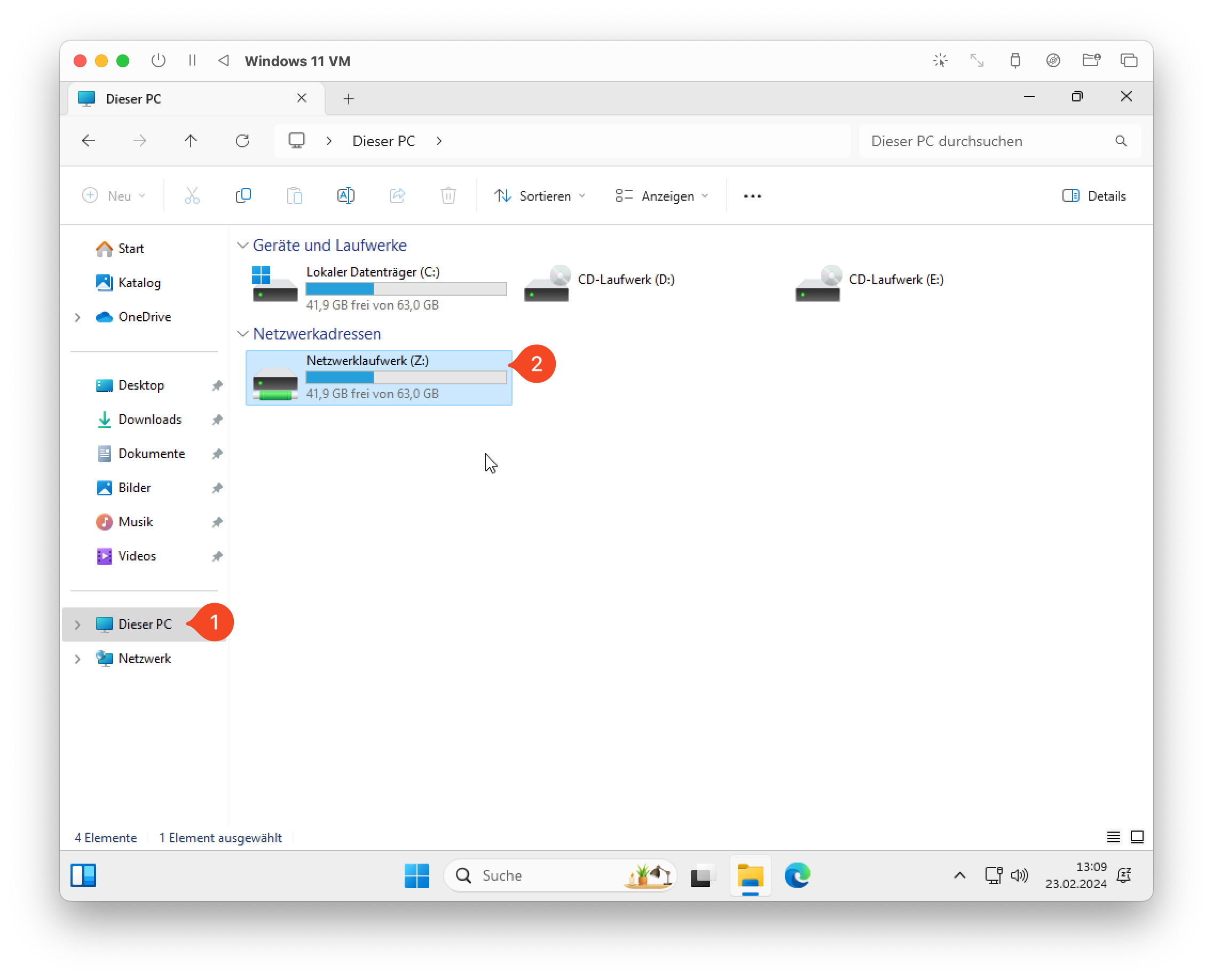 2. Diesen Ordner könnte ihr in eurer VM über den Datei-Explorer von Windows aufrufen. Wählt dazu als erstes "Dieser PC" und anschließend das "Netzlaufwerk (Z:)" aus.