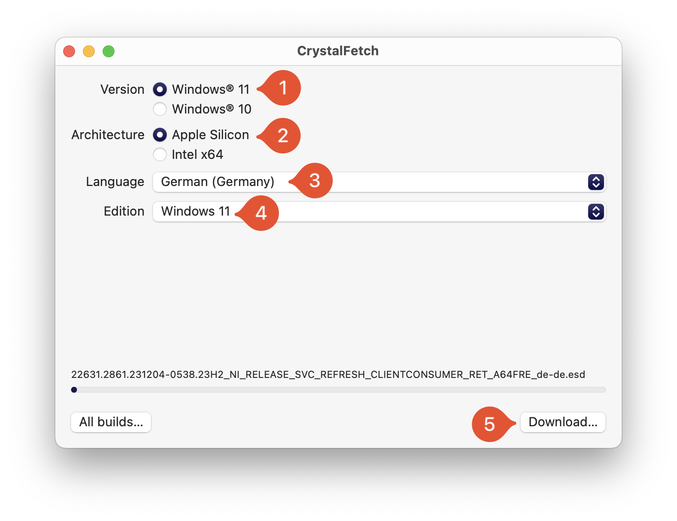 - Öffnet die zuvor installierte Crystal Fetch App. Wählt für den passenden Download Windows 11 als Version, Apple Silicon als Prozessorarchitektur, German als Sprache & Windows 11 als Edition aus. Mit einem Klick auf Download... bestätigen.