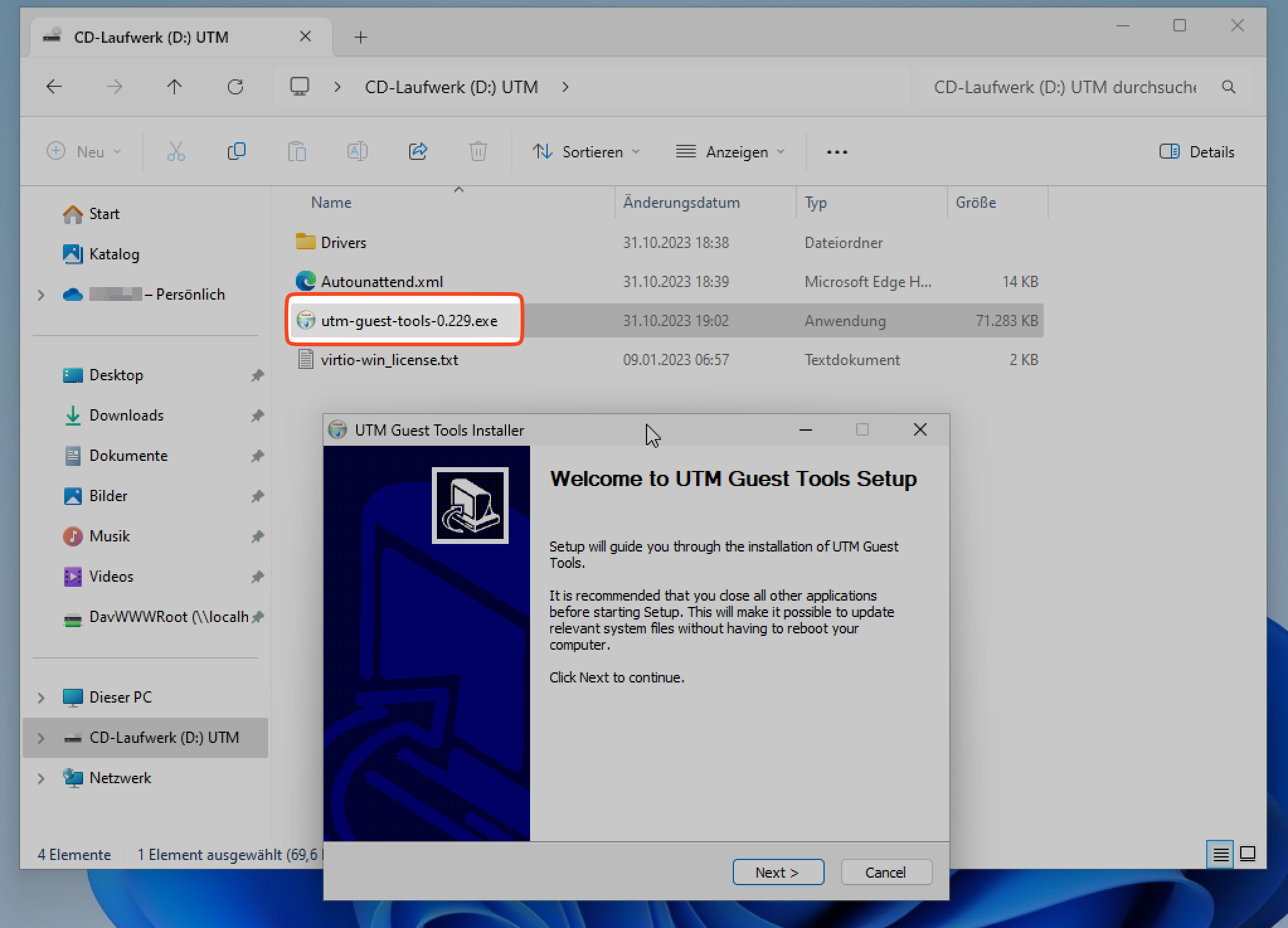 Sollte die Installation der SPICE-Tools nicht automatisch gestartet werden, dann könnt ihr die Installation auch manuell anstoßen. Ruft dazu über den Datei-Explorer das virtuelle Laufwerk mit der gemounteten ISO UTM auf und startet die utm-guest-tools-X.XXX.exe mit einem Doppelklick: