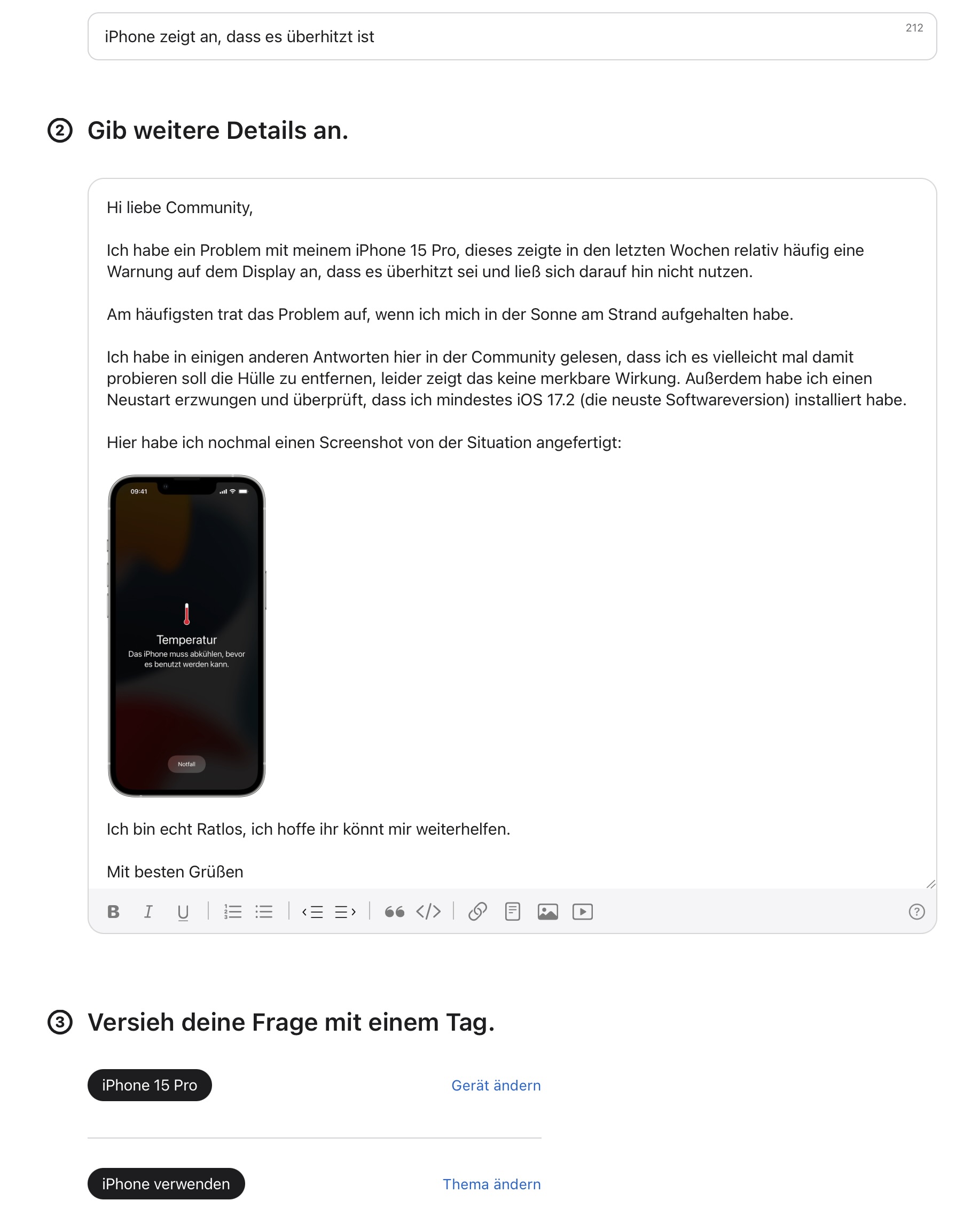 Jede Frage beginnt mit einem kurzen und guten Titel. Wichtig ist hier direkt schon einmal die ersten Schlagworte anzusprechen; ein Titel könnte zum Beispiel sein „iPhone zeigt an, dass es überhitzt ist“. Sollte dein Titel irreführend sein oder nicht das ansprechen, was du danach als Problem schilderst, kann dein Titel von den Moderatoren geändert werden, du wirst dann darüber per Mail in Kenntnis gesetzt.