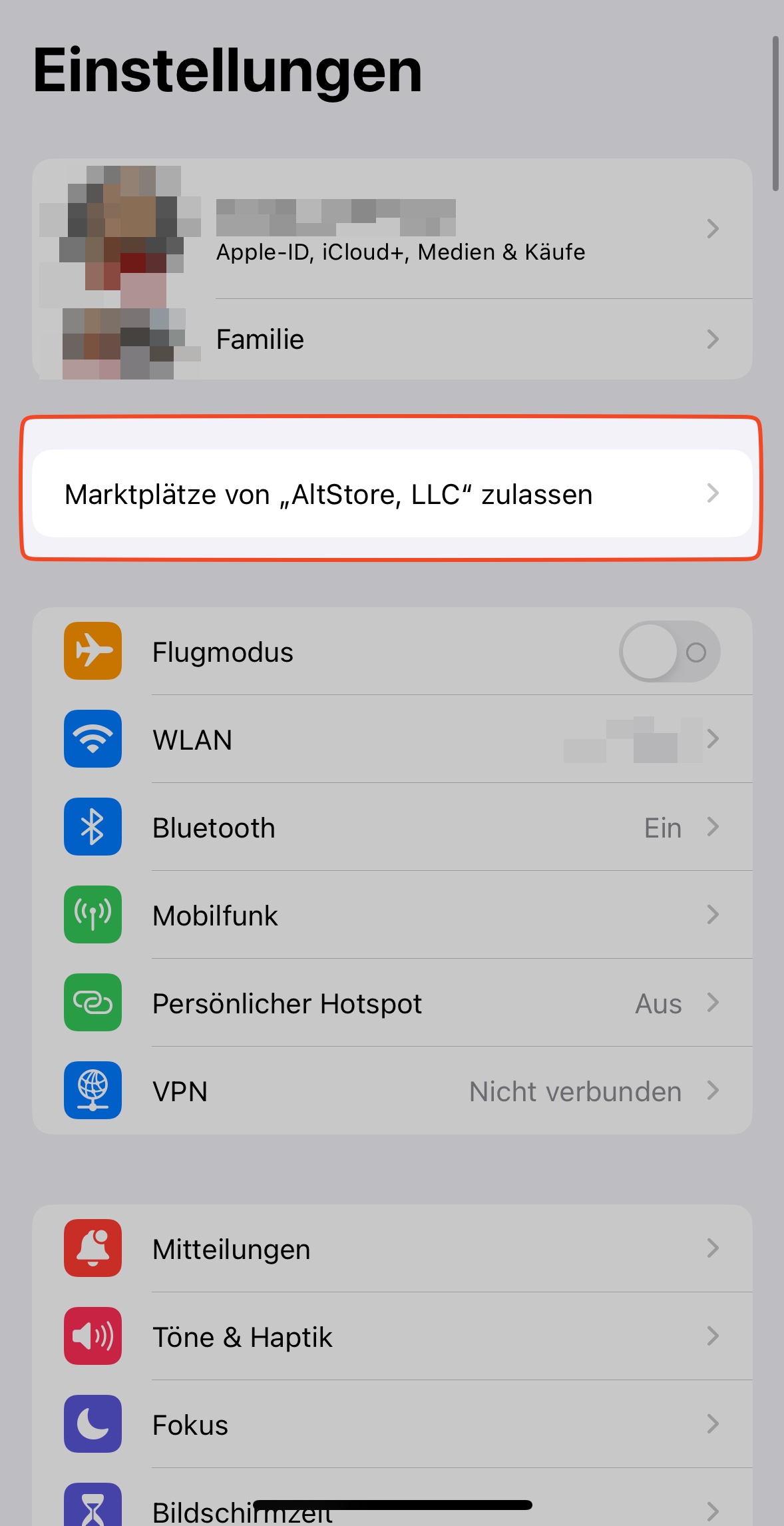 6b. Erhältst du die erwähnte Meldung, tippe auf "OK" & öffne die Einstellungen. Im oberen Bereich unterhalb deines Namens, siehst du ein neue Kategorie: "Marktplätze von "AllStrore, LLC" zulassen, tippe diese an.