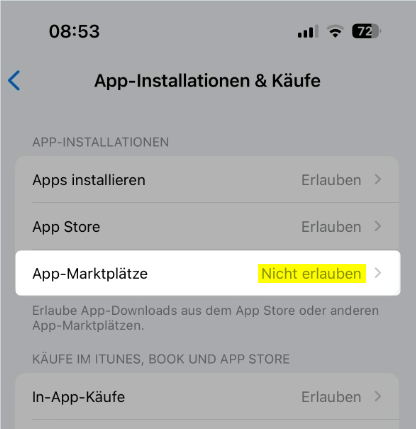 Stelle nun die Erlaubnis zum Installieren aus alternativen App Stores auf "Nicht erlauben" (Einstellungen -> Bildschirmzeit -> Beschränkungen -> App-Installation & Käufe -> App-Marktplatze):