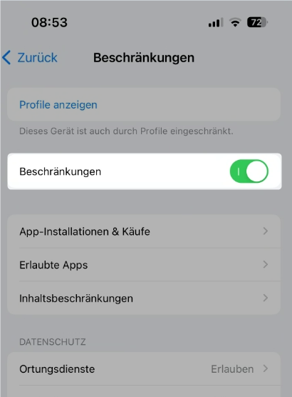 Aktiviere dazu zuerst die Beschränkungen der Bildschirmzeit (Einstellungen -> Bildschirmzeit -> Beschränkungen):