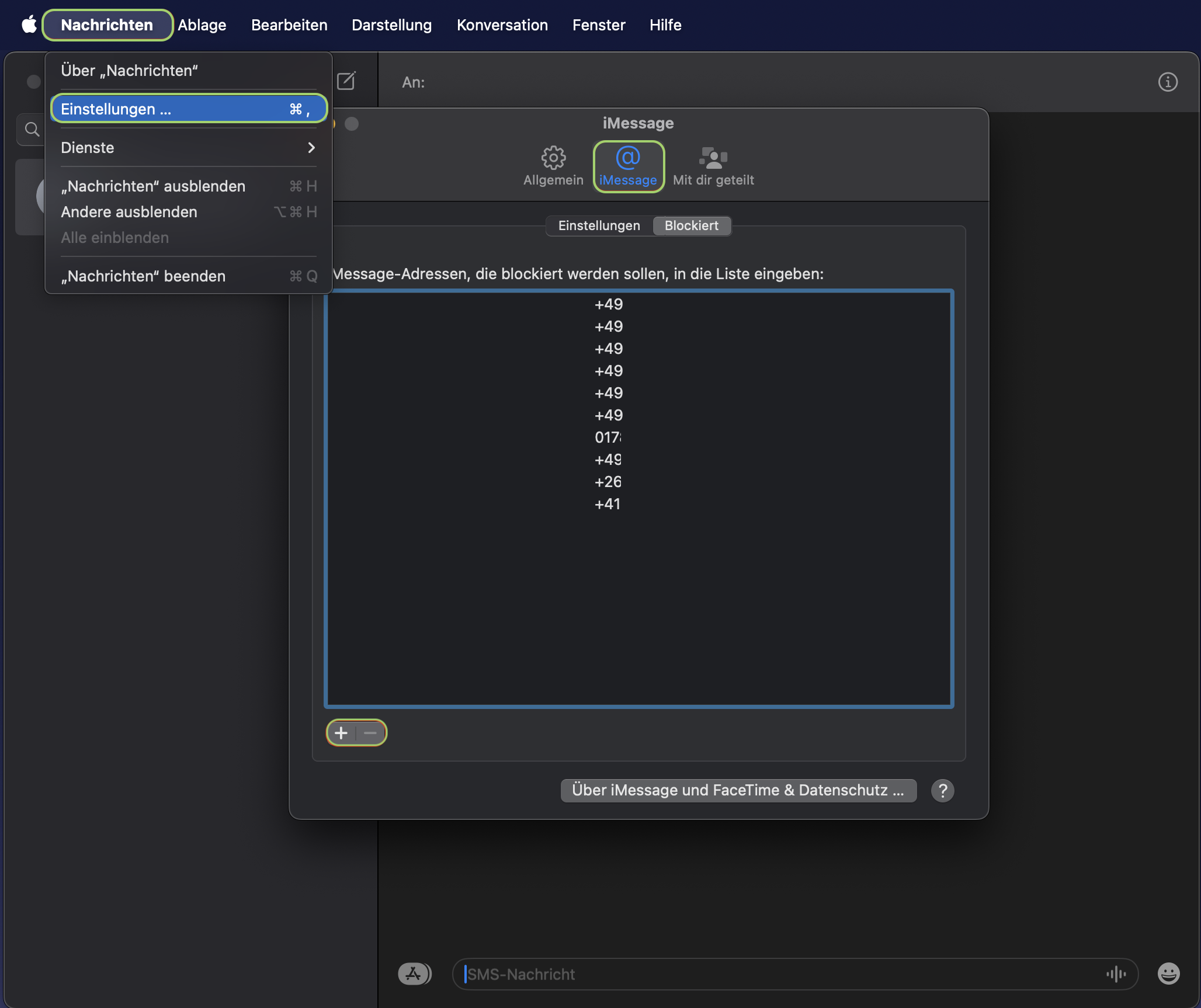 Soll die Blockierung eines Kontaktes wieder aufgehoben werden, öffne wieder die Nachrichten-App und klicke in der Menüleiste auf „Nachrichten“. Gehe dann zu