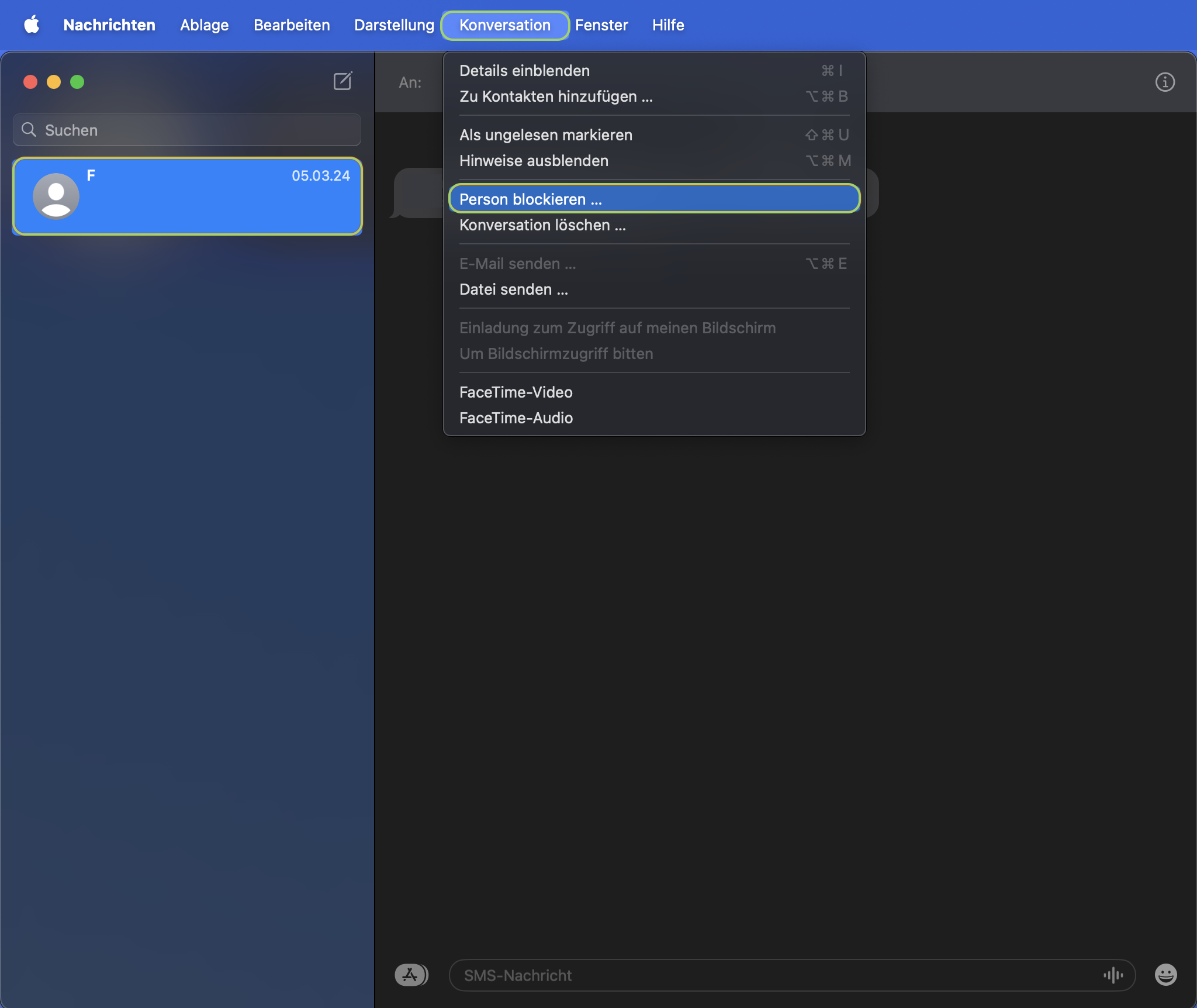 und klicke in der Menüleiste auf „Konversation“. Klicke danach auf „Person blockieren …“, um künftig keine Nachrichten vom ausgewählten Absender zu erhalten.