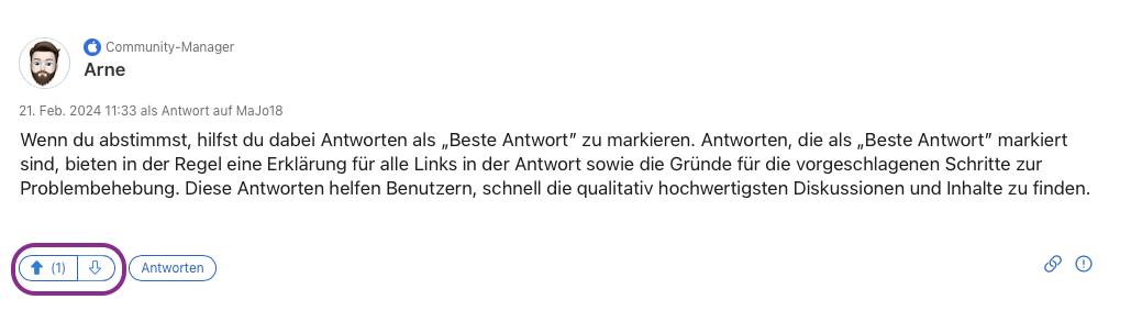 Eure Votes sind für alle User von großer Bedeutung, weil dadurch schnell hilfreiche Antworten herausgehoben werden können. Wichtig ist dabei zu wissen, dass die Benutzer und Benutzerinnen, die eure Fragen beantworten, nur Punkte für positive Bewertungen erhalten, wenn ihr in der Community angemeldet seid.