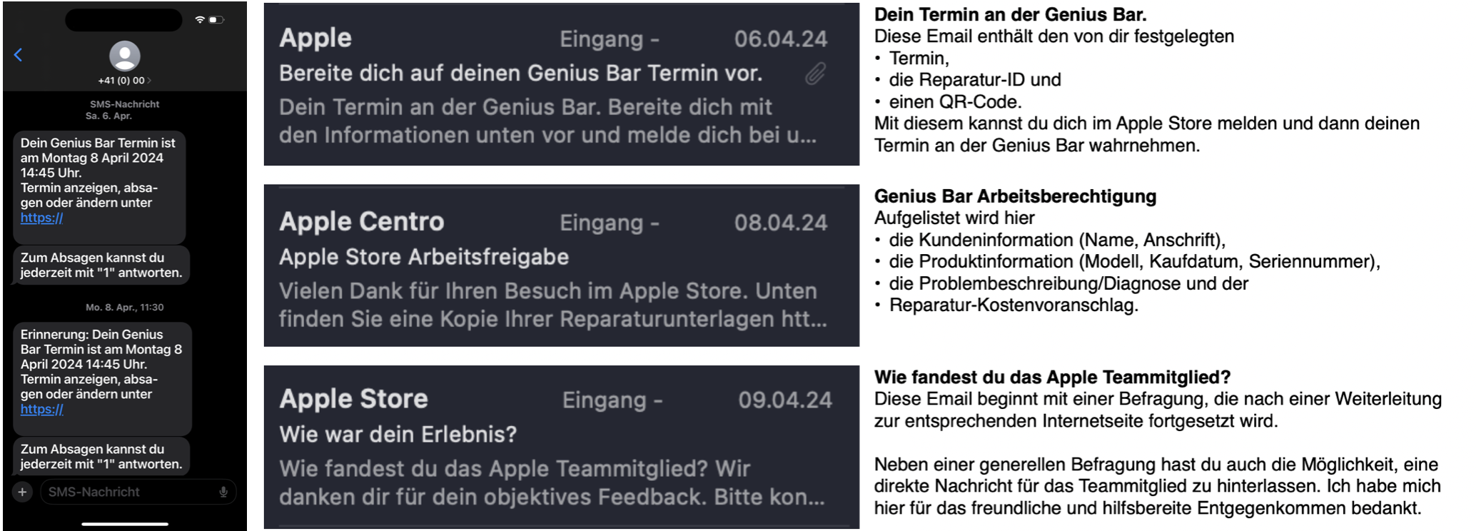 Auch der für mich passenden Termin an der Genius Bar war schnell gefunden und ließ sich problemlos in meinen Kalender übernehmen. Von nun an wurde ich über SMS und via Mail über die einzelnen Schritte und Abläufe informiert.