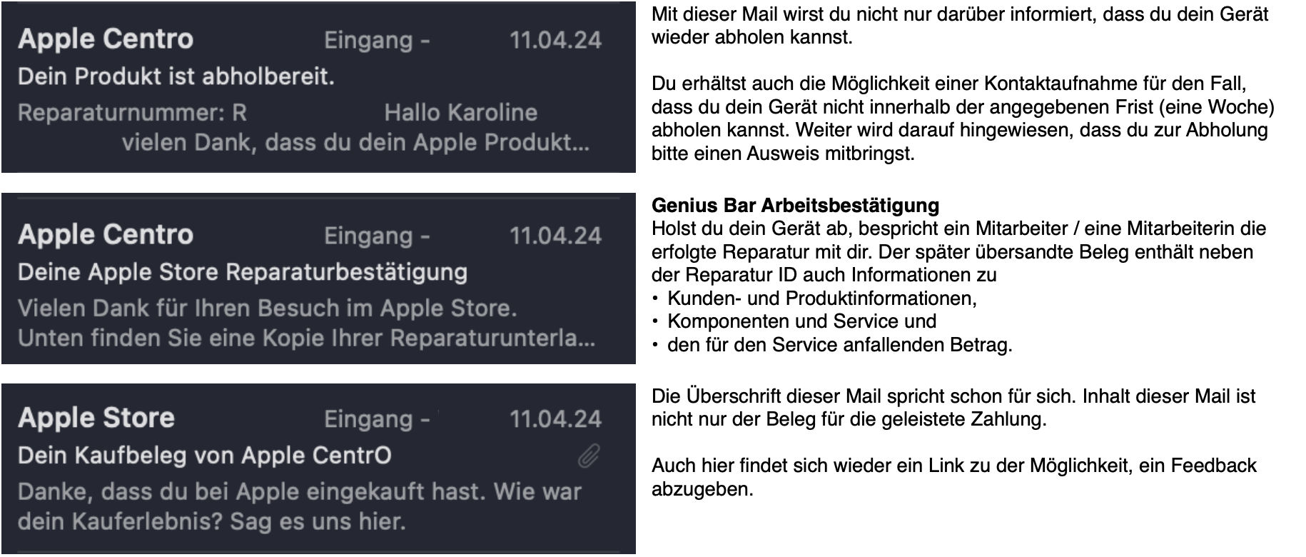 An der Genius Bar nahm sich ein weiterer Mitarbeiter meiner Sache an, besprach mit mir das Problem und machte mir Vorschläge bezüglich der Reparatur selbst und des späteren Abholtermins (etwa eine Woche später). Die aus diesem Gespräch erstellte Arbeitsberechtigung wurde mir via Mai zugesandt und ich wurde über die nun folgenden Arbeitsschritte via Mail unterrichtet.
