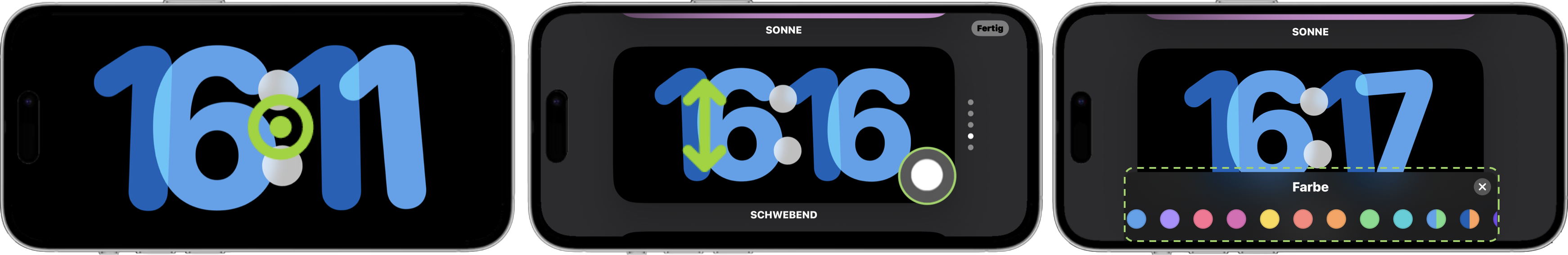 Selbstverständlich lässt sich auch die Darstellung der reinen Zeitanzeige farblich verändern. Tippe so lange auf das Display, bis die Anzeige in den Bearbeitungsmodus wechselt.